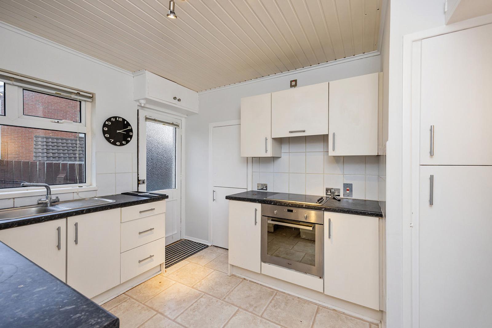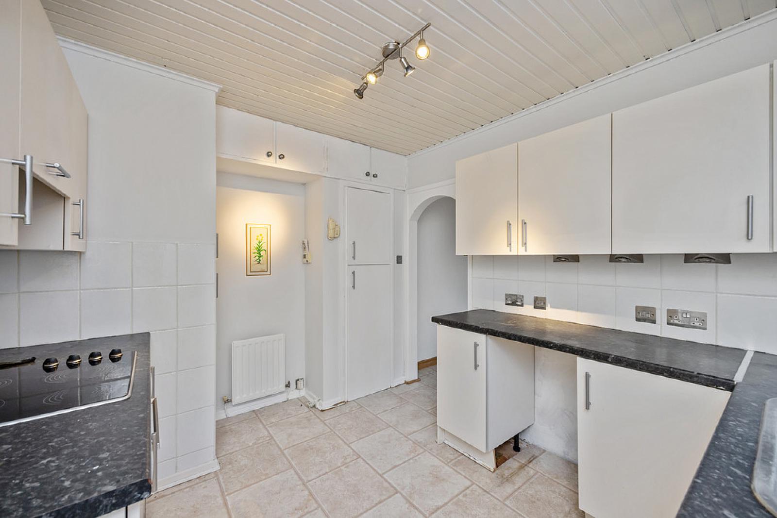 KITCHEN 12' 2" x 9' 2" (3.73m x 2.81m) Excellent range of high and low level units, chrome handles, formica work surfaces, stainless steel sink unit, space for under counter fridge, plumbed for washing machine, integrated oven and hob, under stair storage, partly tiled walls.