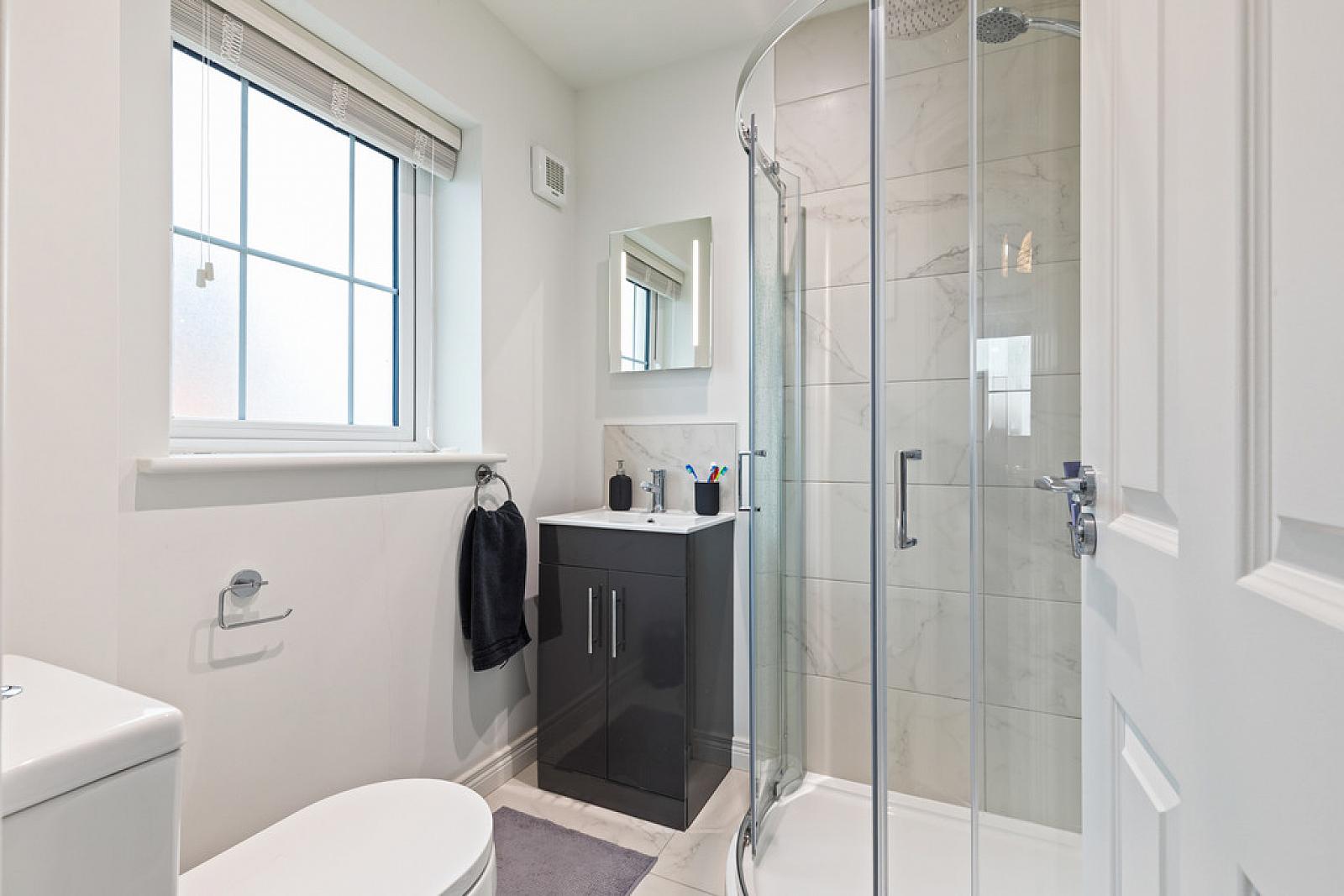 ENSUITE Fully tiled shower cubicle with drench style shower, wash hand basin with chrome taps and storage under and tiled splash back, LED mirror, low flush w.c, partly tiled walls, tiled floor, spot lighting.