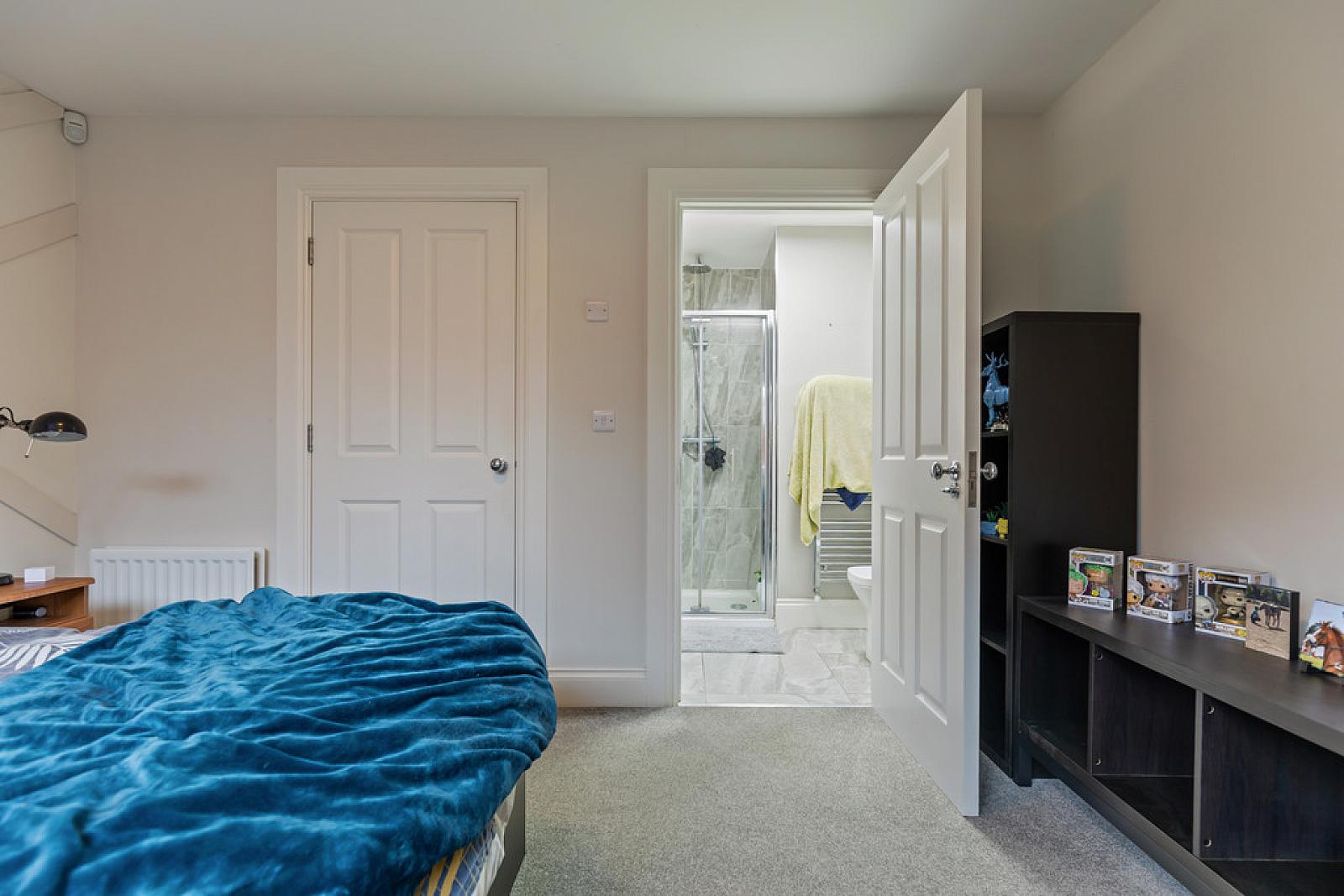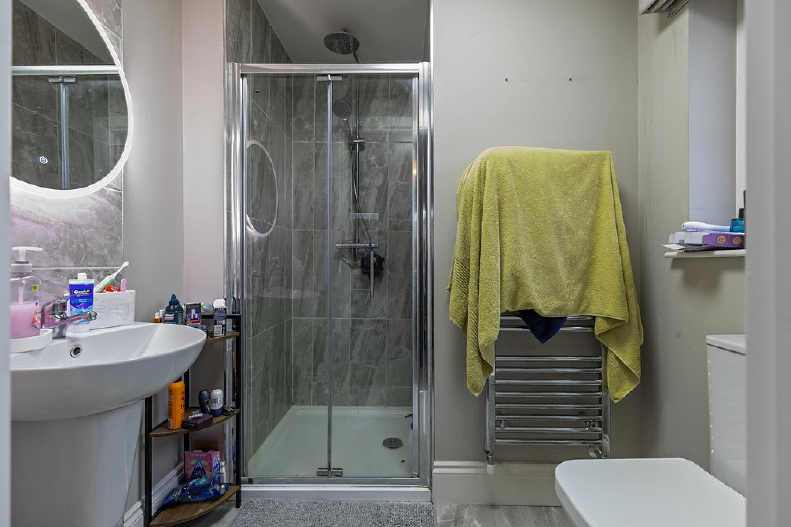 ENSUITE Fully tiled shower cubicle with drench style shower, low flush w.c, wall hung wash hand basin with chrome taps and tiled splash back, heated chrome towel radiator, tiled floor, partly tiled walls.