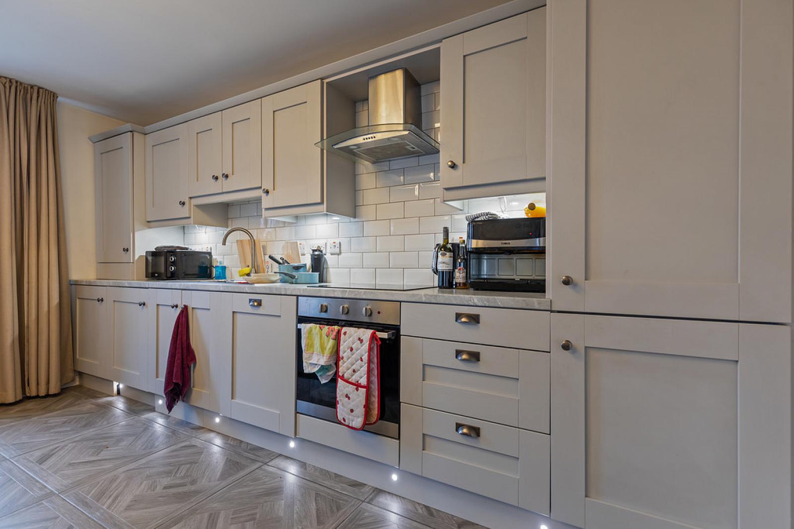 OPEN PLAN KITCHEN / LIVING / DINING ROOM 16' 2" x 14' 7" (4.95m x 4.47m) Excellent range of high and low level units with chrome handles, feature under lighting, kickboard lighting, marble effect work surfaces, stainless steel sink unit, integrated oven and hob with chrome extractor fan with glass canopy over, integrated fridge freezer, washing machine and dishwasher, tiled floor, partly tiled walls.