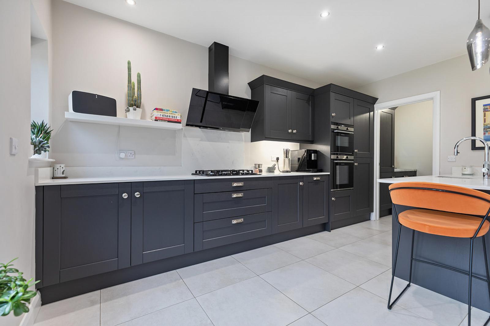 KITCHEN / LIVING / DINING ROOM 18' 8" x 14' 11" (5.69m x 4.55m) Stunning kitchen with an excellent range of high and low level units offering an abundance of storage with chrome handles, feature under lighting, quartz work surfaces and matching upstand, stainless steel sink unit with chrome swan mixer tap, Quooker boiling water tap with filtered cold water, integrated oven and five ring Nordmende gas hob and quartz splash back, Esto extractor fan with glass canopy, integrated combination microwave, integrated fridge freezer, integrated dishwasher, space for wine cooler, pull out under counter bin, breakfast bar, remote control electric blinds, tiled floor, spot lighting.