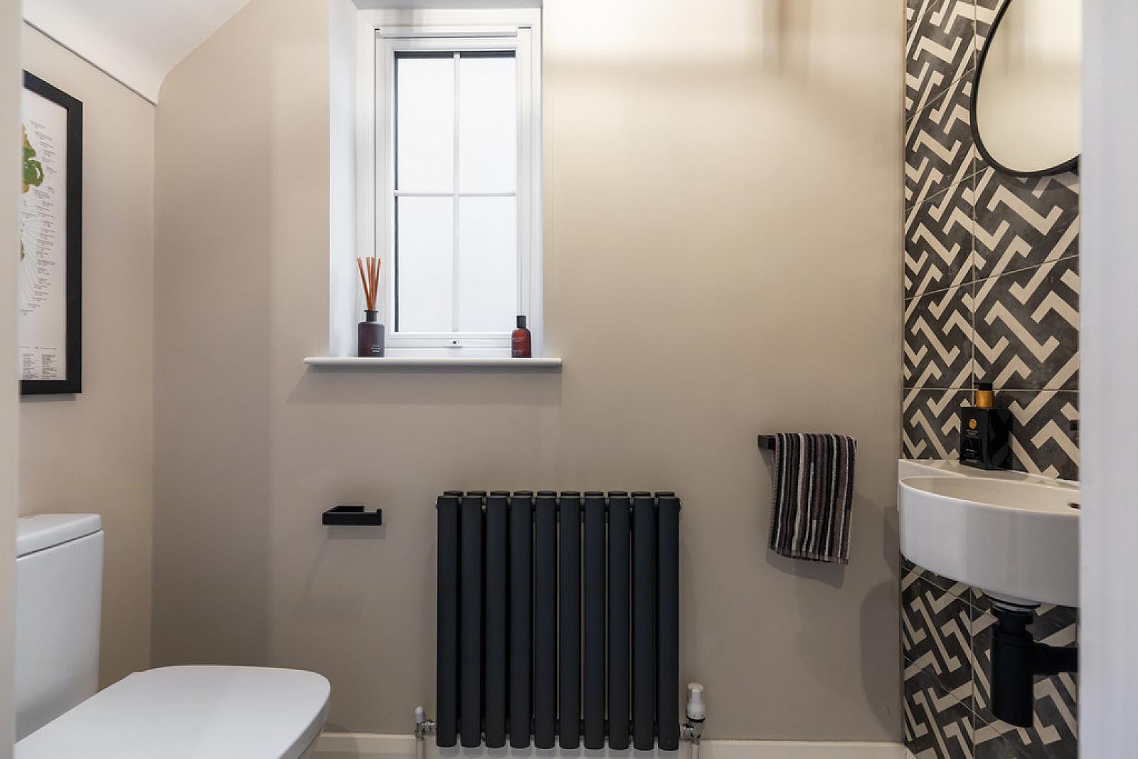 DOWNSTAIRS W.C Low flush w,c, wall hung wash hand basin, partly tiled walls, tiled floor.