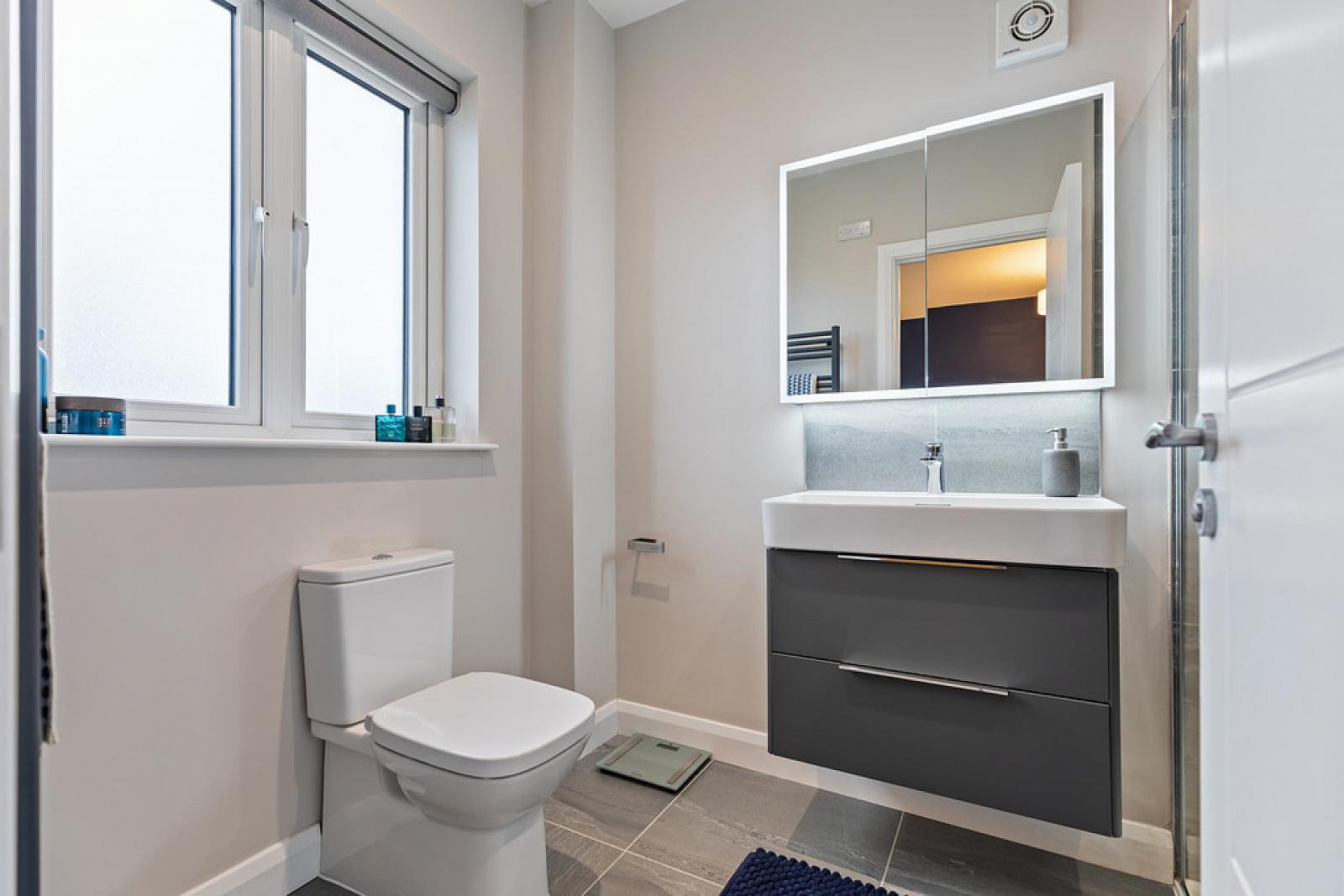 ENSUITE SHOWER ROOM Low flush w.c, wall hung wash hand basin with chrome taps, tiled splash back and storage under, fully tiled double size shower cubicle with drench style shower and soaps recess, heated towel radiator, partly tiled walls, tiled floor, spot lighting.