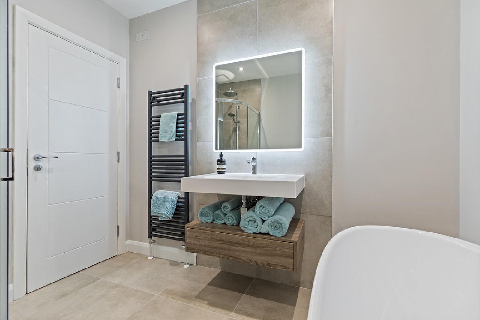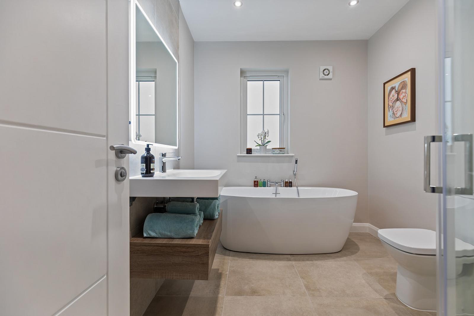 FAMILY BATHROOM Contemporary white suite comprising of a low flush w.c, luxury oval bath with chrome taps, fully tiled shower cubicle with drench style shower and soaps recess, wall mounted wash hand basin with chrome taps and storage under, heated towel radiator, partly tiled walls, tiled floor, spot lighting.
