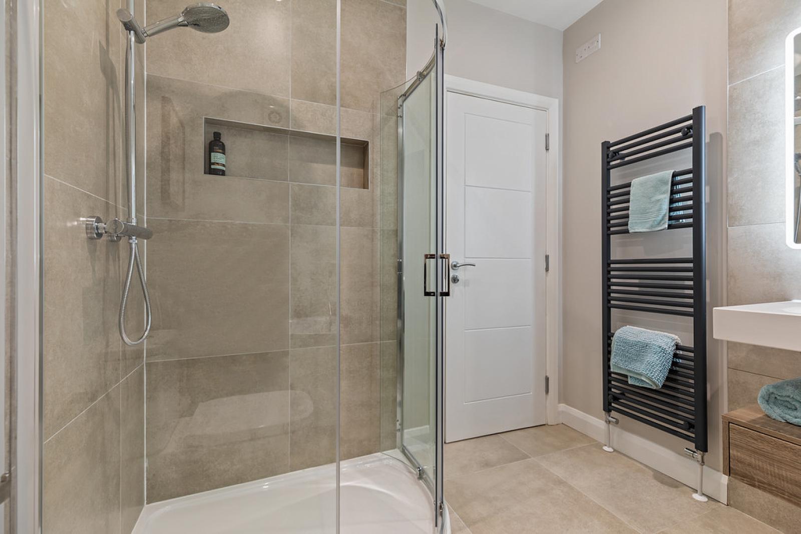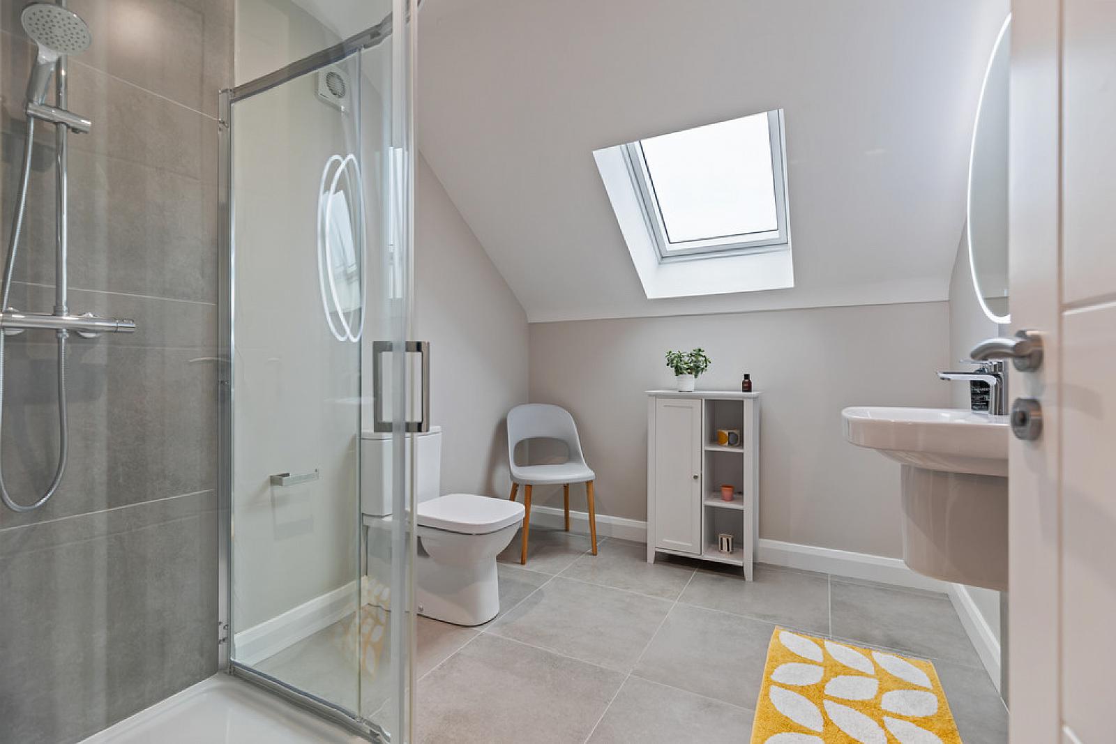 LUXURY SHOWER ROOM Fully tiled shower cubicle with chrome taps and drench style shower with soaps recess, low flush w.c , wall hung wash hand basin with chrome taps, tiled splash back, heated towel radiator, velux window, partly tiled walls, tiled floor, spot lighting, velux windows.