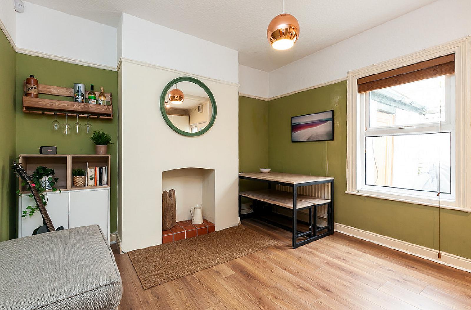 Dining area: Recess for fireplace, picture rail.