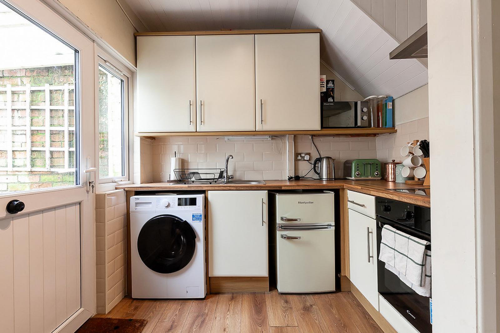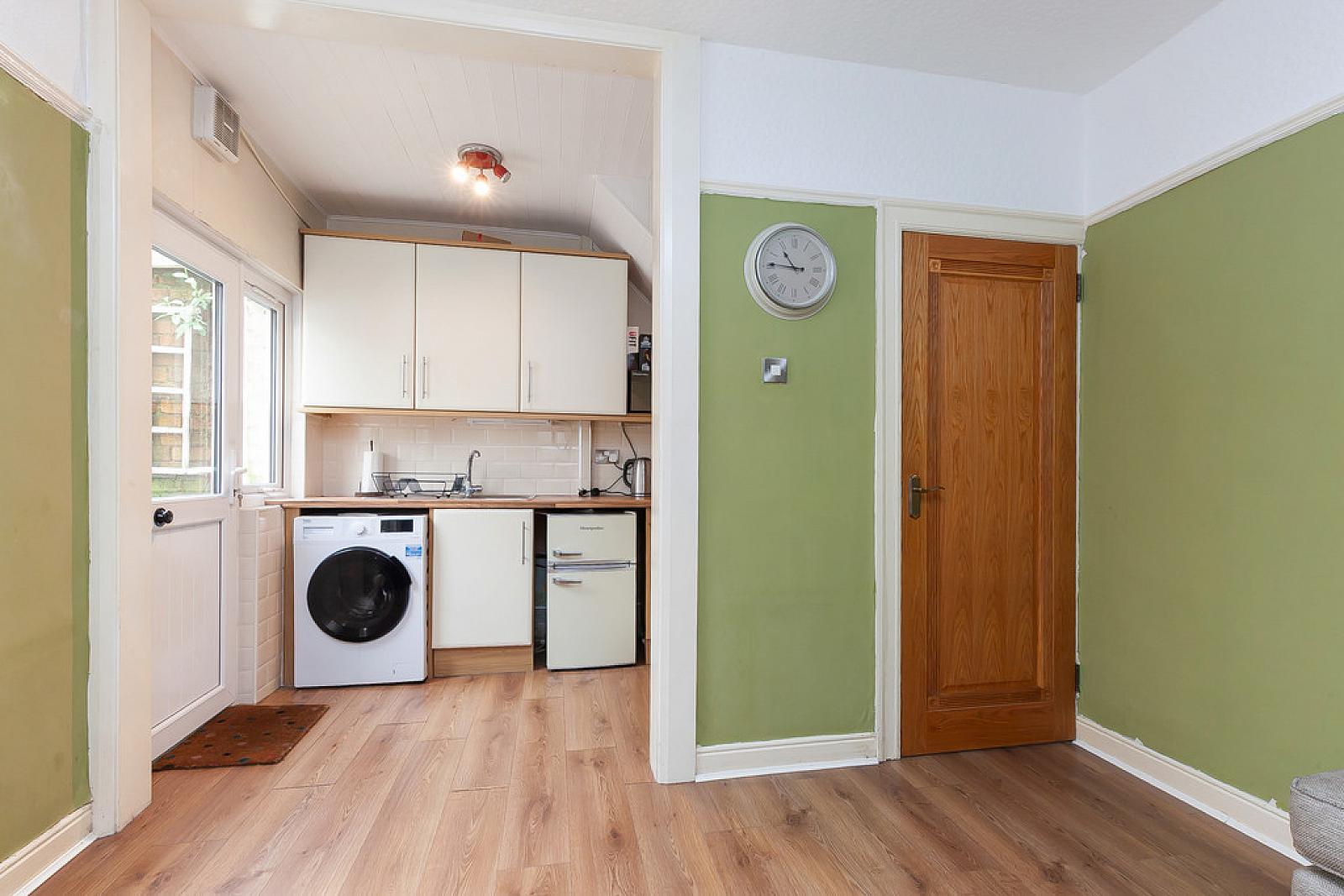 KITCHEN OPEN TO DINING ROOM 15' 11" x 11' 1" (4.87m x 3.38m) Kitchen: Range of high and low level units with with chrome handles, wood effect work surfaces, stainless steel sink unit with chrome tap, integrated oven and hob with chrome extractor fan, space for fridge freezer, plumbed for washing machine, partly tiled walls.
