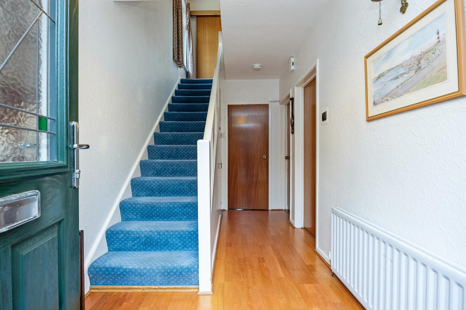 ENTRANCE HALL uPVC front door and side windows, under stair storage, wood strip flooring.