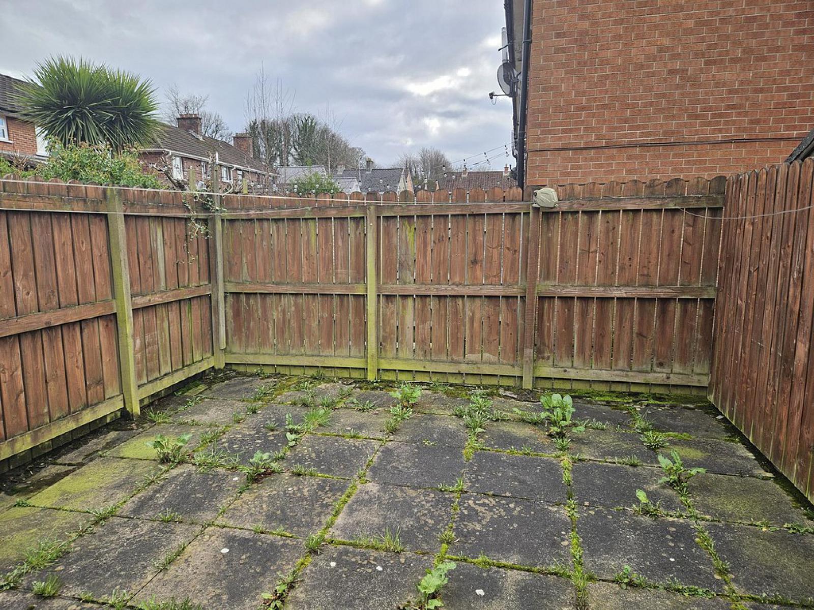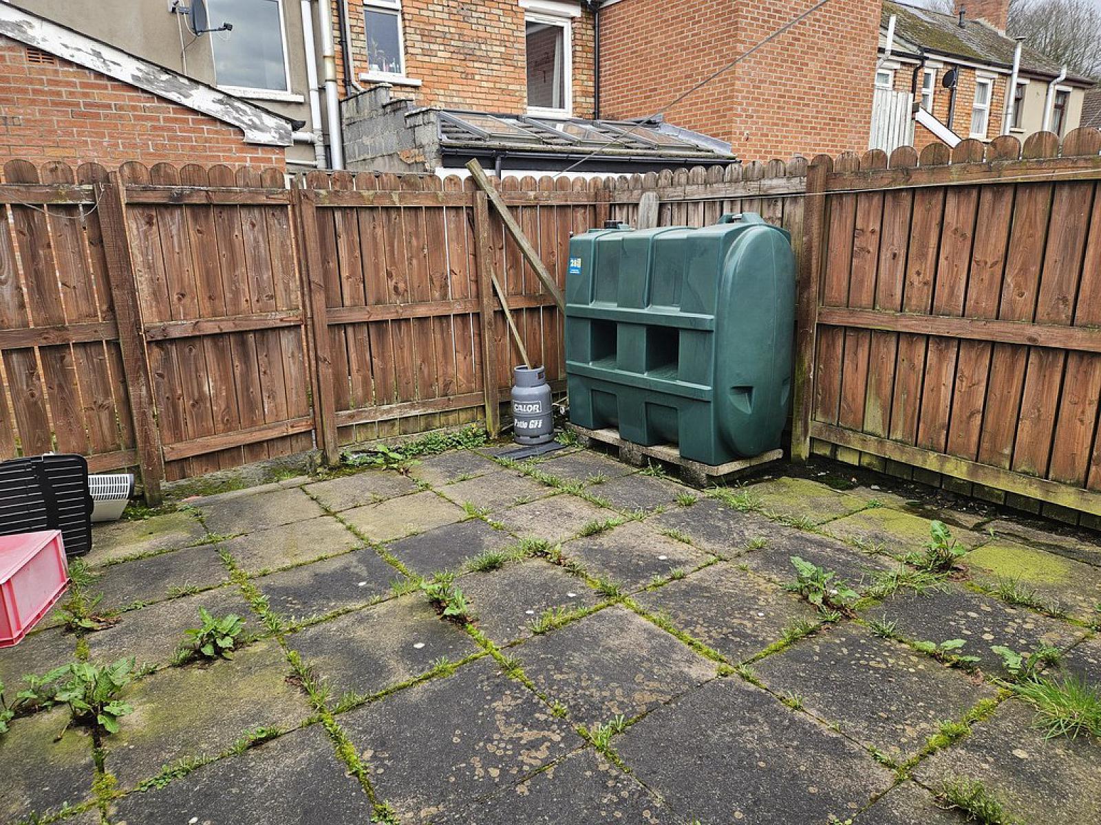 Paved garden area with timber fencing and oil tank.