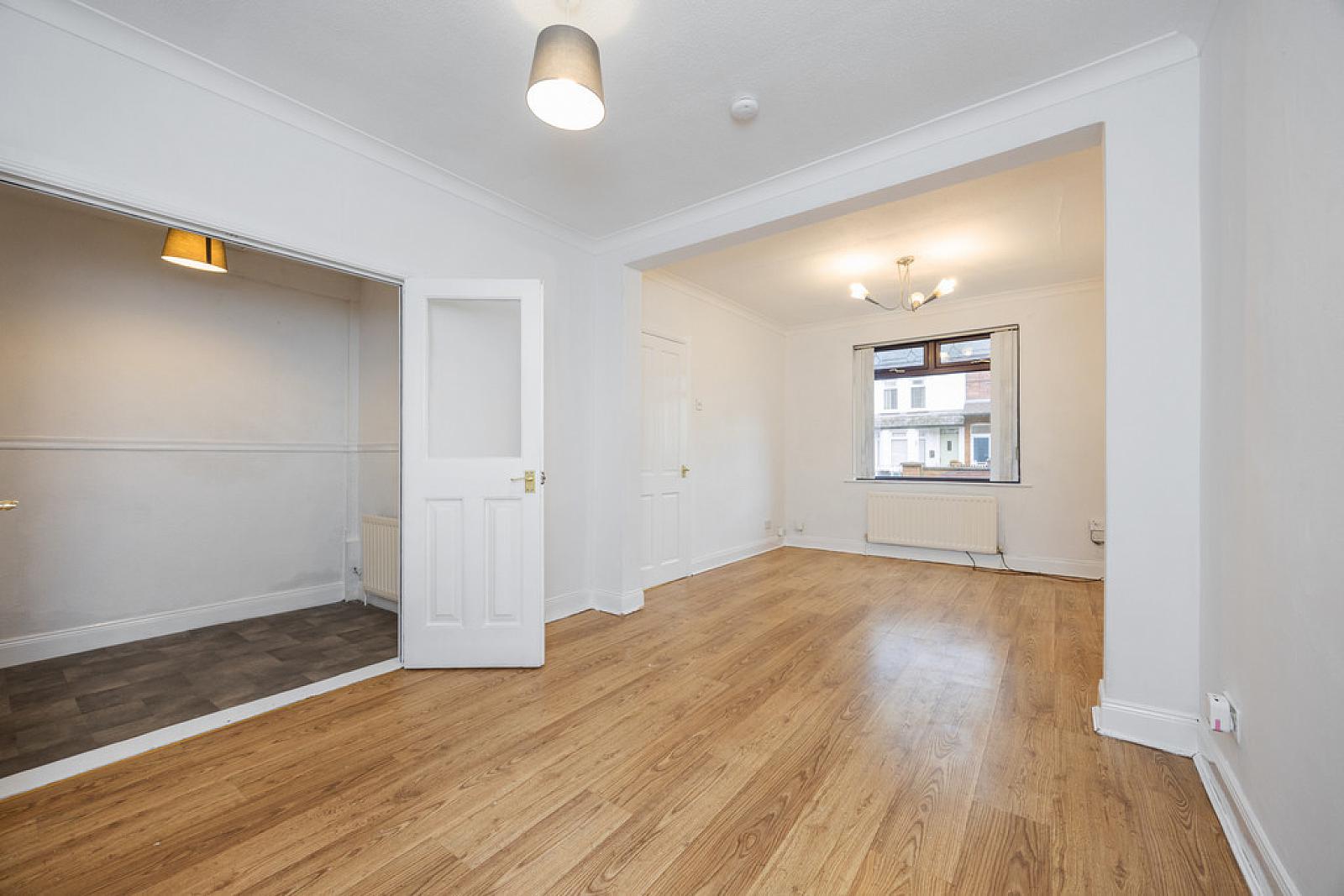 LIVING ROOM 20' 0" x 9' 9" (6.11m x 2.99m) Laminate wooden floor. Double doors to rear garden.