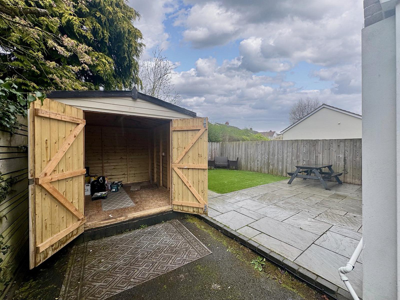 Internally, the property opens into a spacious hallway, leading to a front reception room complete with a feature log-burning stove. To the rear, there is a bright open-plan dining and kitchen area, featuring a fully fitted modern kitchen with both high and low units, as well as integrated appliances. An outdoor shed provides additional convenience, being plumbed for a washing machine.