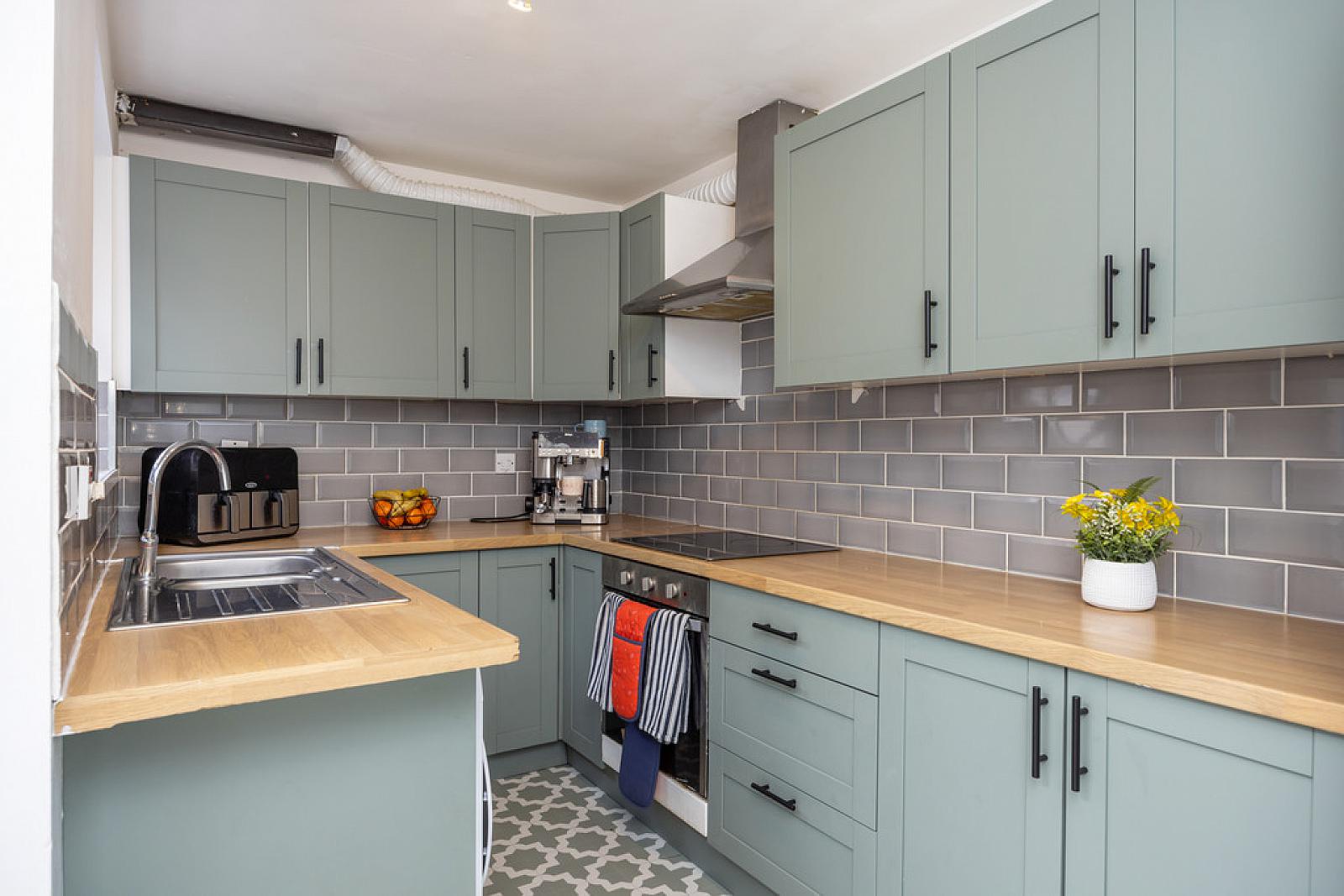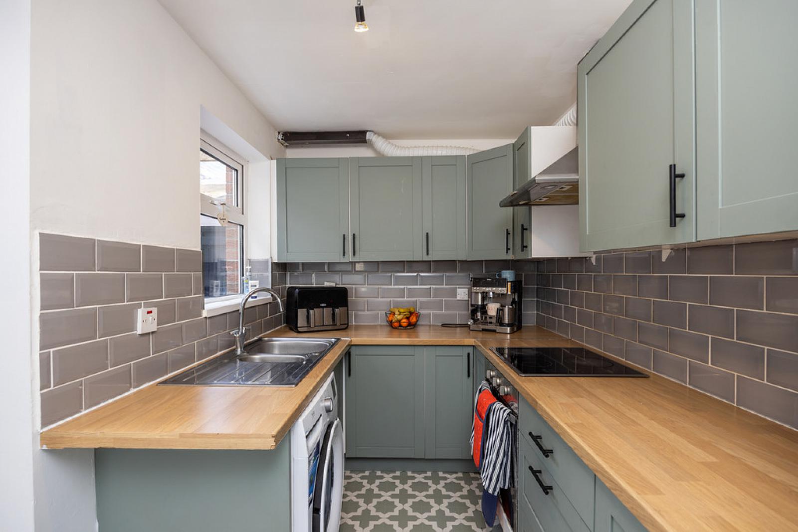KITCHEN 12' 4" x 12' 1" (3.761m x 3.701m) Range of high and low units with formica worktops and 1.5 stainless steel sink unit with mixer tap and tiled splash back. Integrated electric oven and hob with stainless steel extractor hood. Plumber for washing machine. Space for fridge freezer. Access to enclosed covered yard. Utility store is accessed via yard.