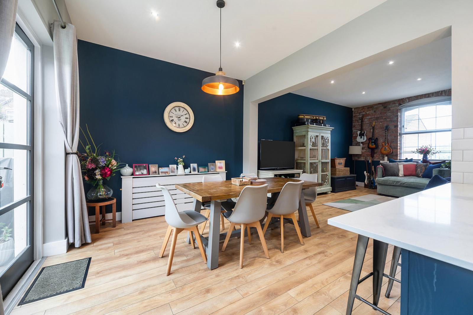 Upstairs, the first floor offers three well-proportioned bedrooms along with a contemporary bathroom fitted with a modern suite and feature freestanding bath.