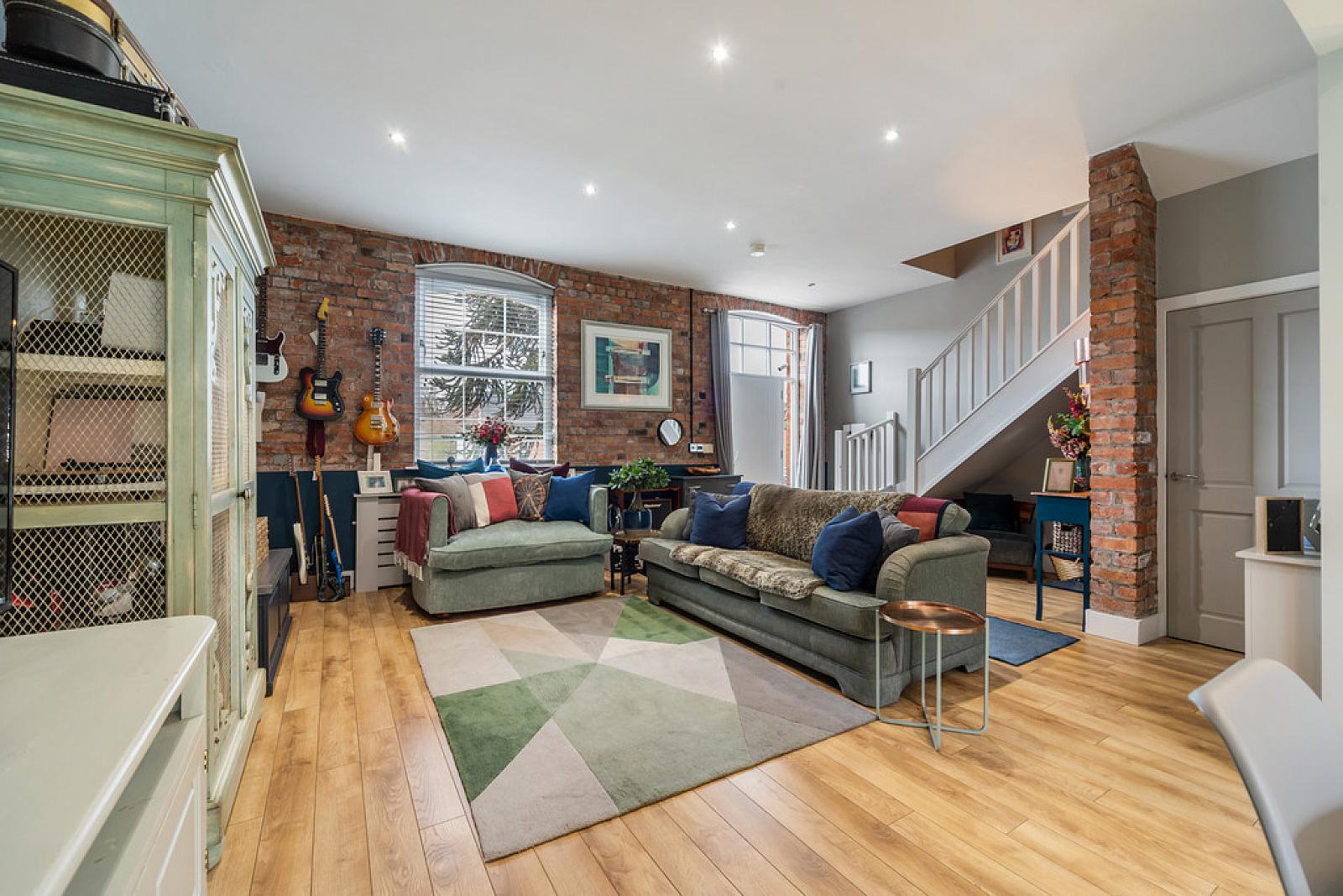 LOUNGE 21' 5" x 15' 10" (6.53m x 4.85m) Feature exposed brick wall, low voltage spotlights, wooden floor, open floor to...