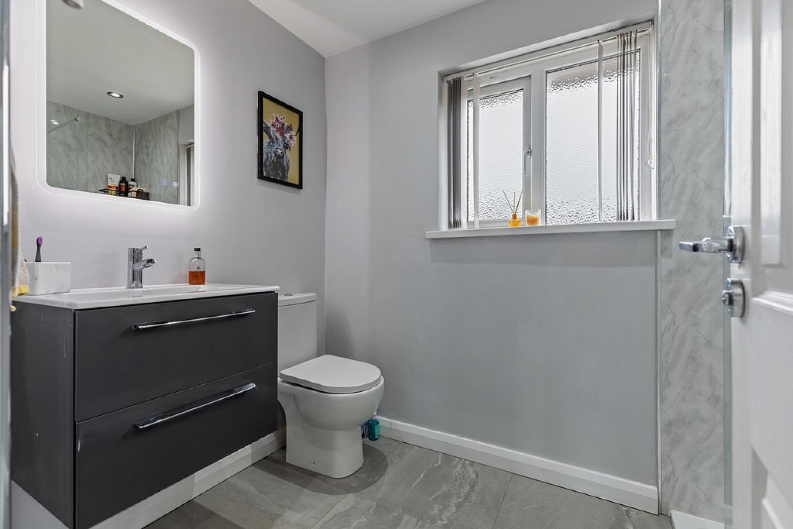 SHOWER ROOM Multi panelled shower cubicle with drench style shower, wall hung wash hand basin with chrome taps, LED mirror, low flush w.c, heated chrome towel radiator, tiled floor, spot lighting.