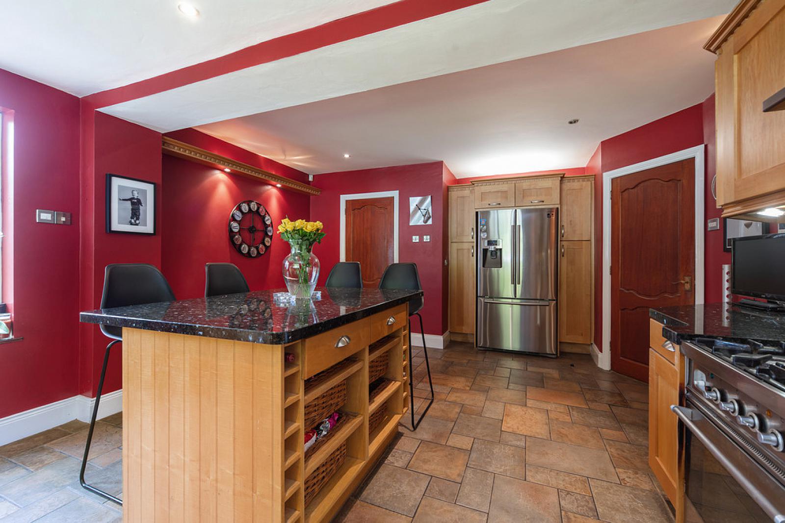 KITCHEN WITH BREAKFAST AREA 18' 9" x 14' 3" (5.72m x 4.34m) Range of high and low level units, granite work surfaces, 1.5 bowl stainless steel sink unit with granite drainer, Britannia cooker range with gas hob, electric oven, extractor fan, stainless steel splashback over, integrated dishwasher, plate rack, glass display cabinets, island unit with matching granite work surfaces, breakfast bar, external access, part tiled walls, tiled floor, low voltage spotlights, housing and plumbing for American fridge freezer.
