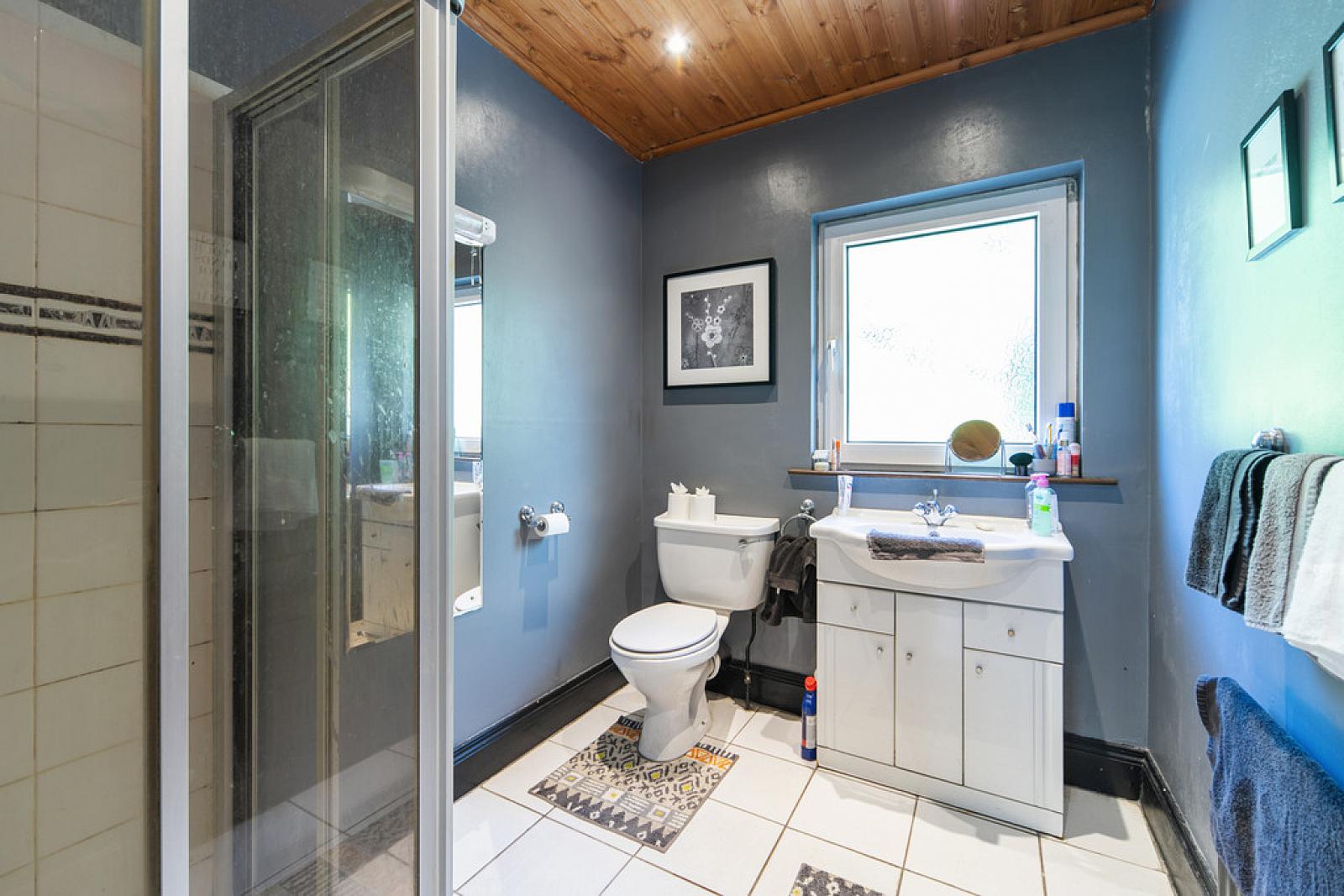 ENSUITE SHOWER ROOM White suite comprising vanity unit, low flush WC, fully tiled shower cubicle, tiled floor, tongue and groove ceiling, low voltage spotlights.