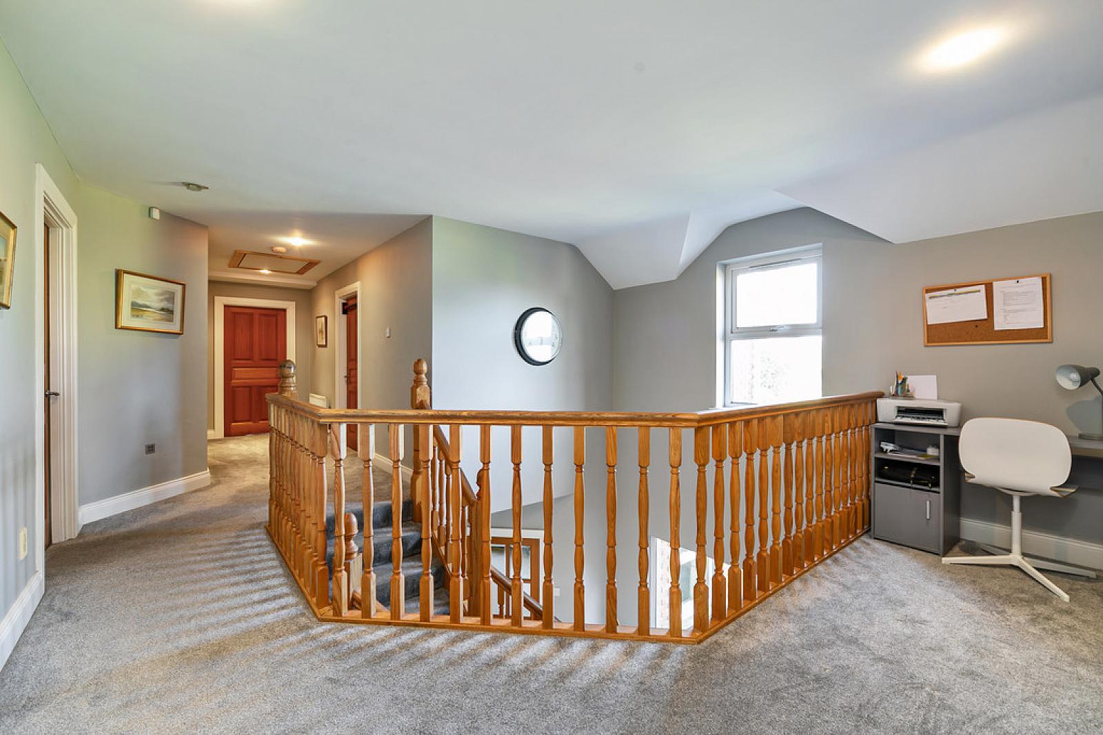 FIRST FLOOR LANDING Mistrels gallery, hot press, single panel radiator and access to partially floored roof space.