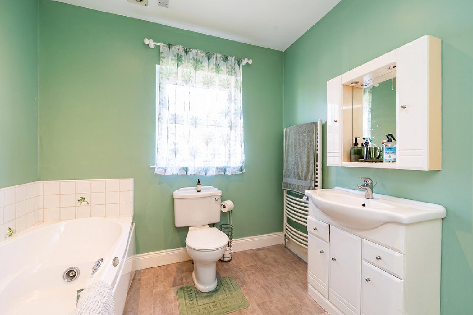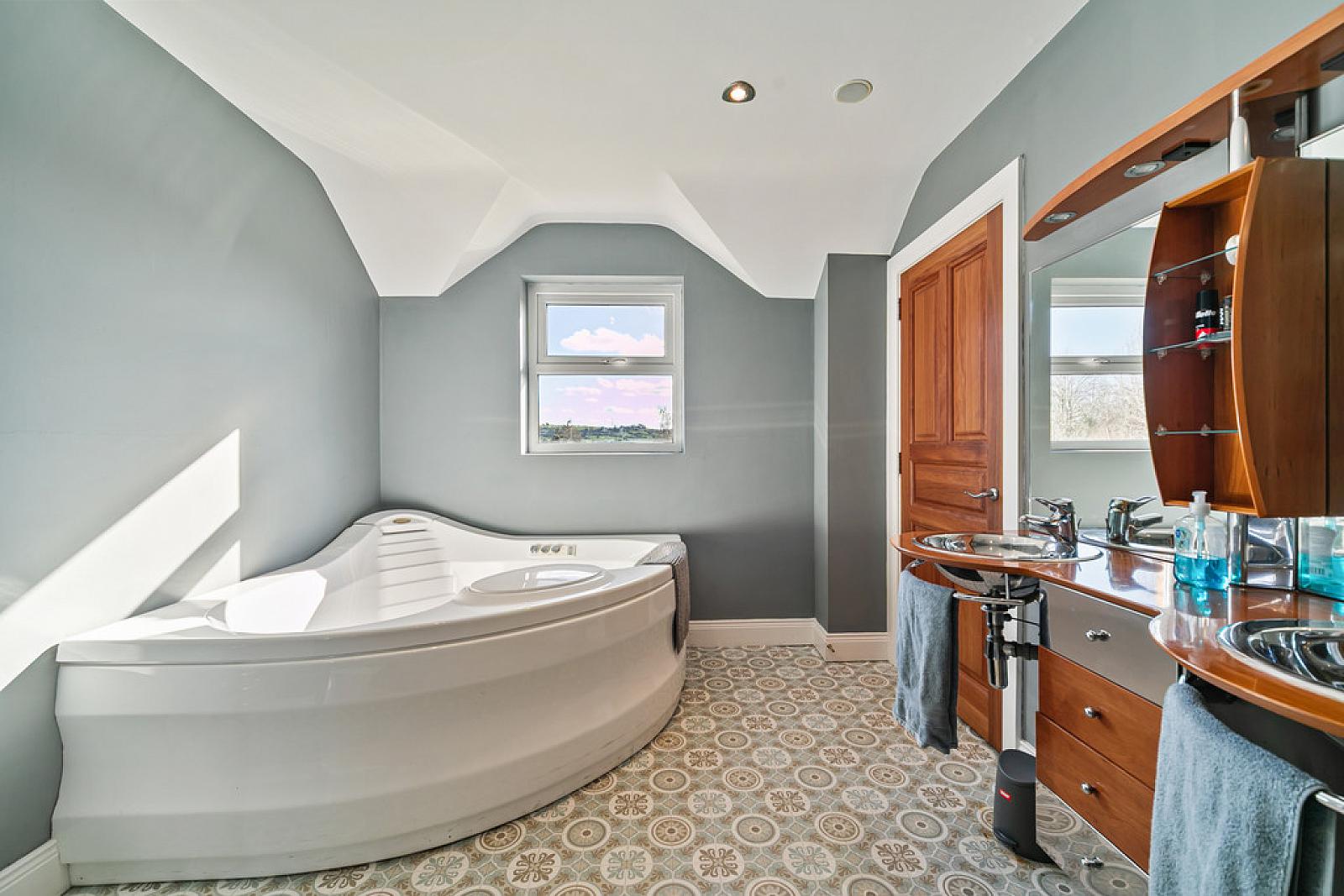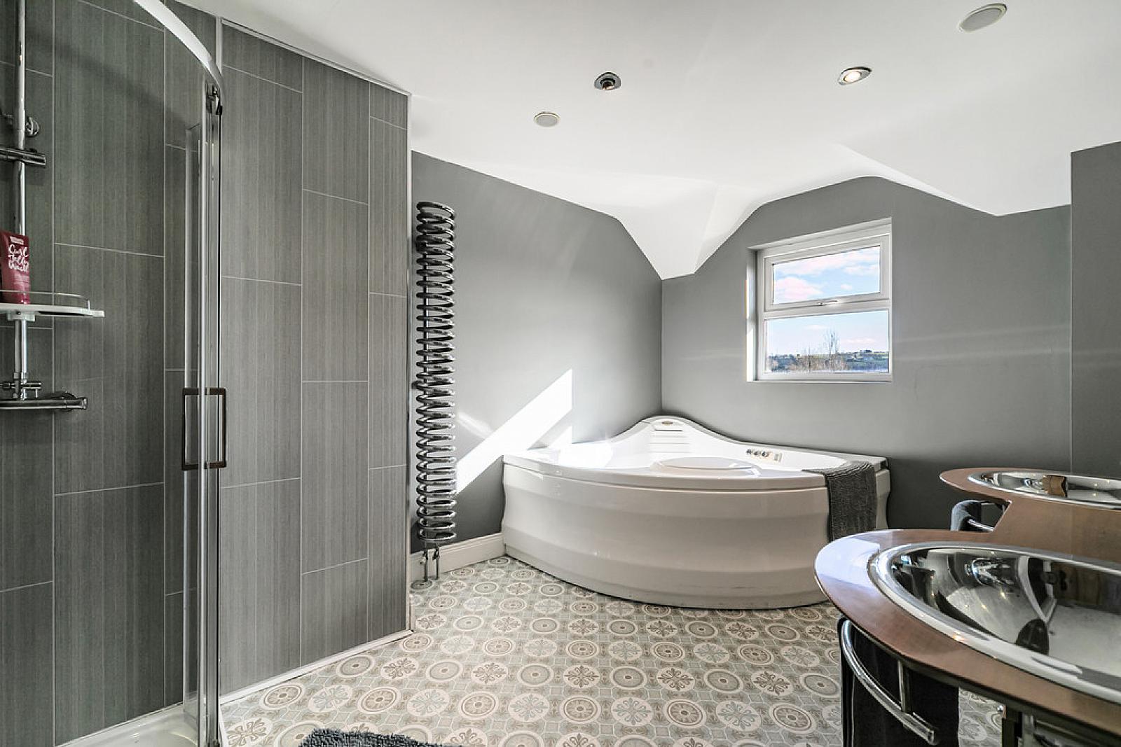 BATHROOM 8' 2" x 9' 5" (2.49m x 2.87m) White suite comprising jacuzzi bath, tiled corner shower cubicle, vanity wash hand basin, low flush WC and heated towel rail.