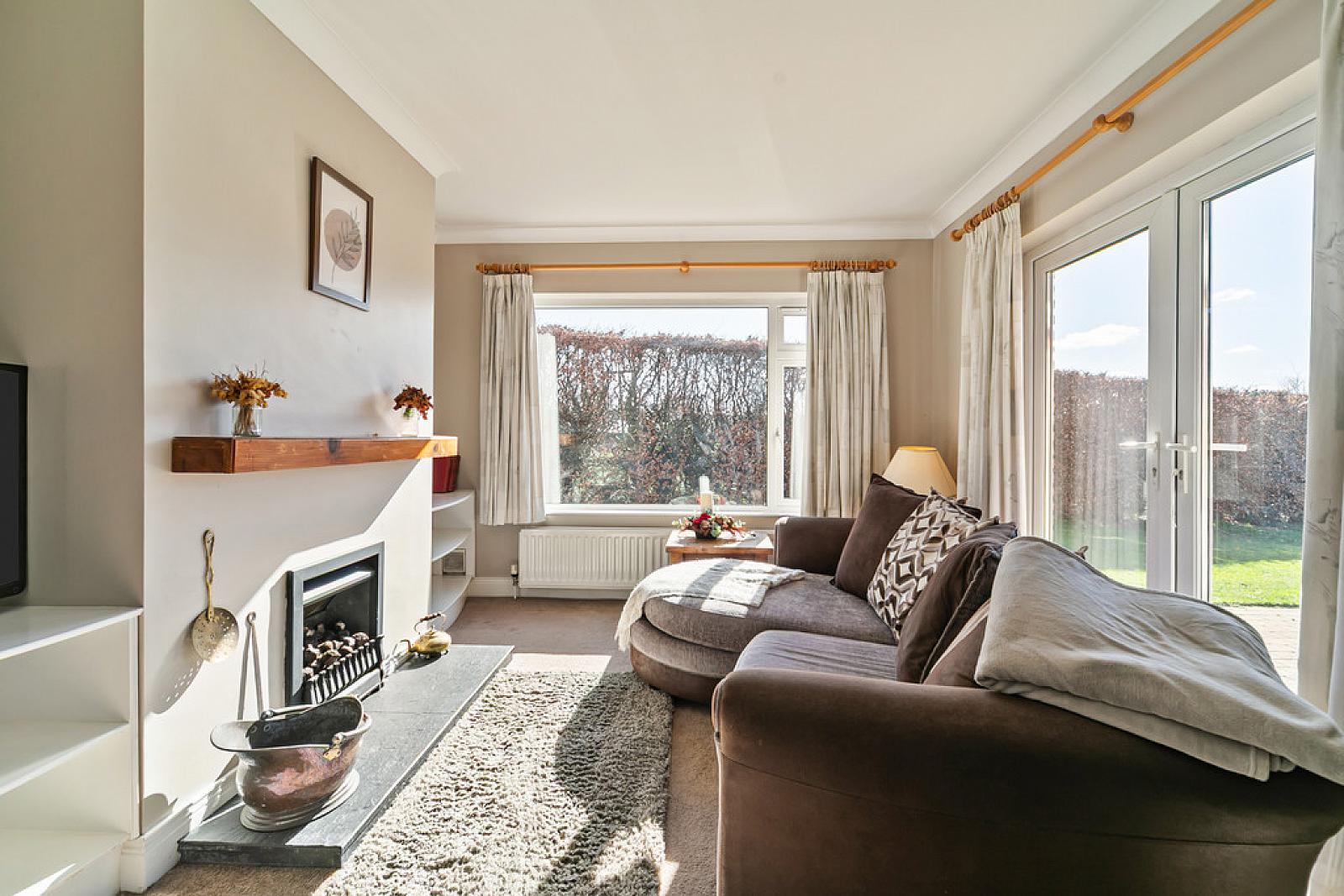 SITTING ROOM 11' 1" x 16' 6" (3.38m x 5.03m) Gas effect fire with wood mantle and slate hearth. Double panel radiator and double glazed doors to rear patio.
