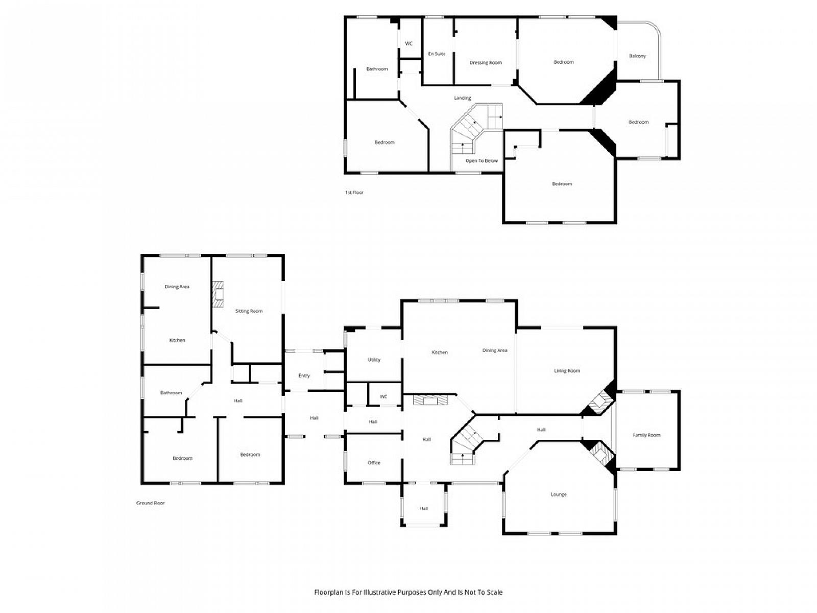 The ground floor is equally impressive, centred around a welcoming reception hall with a striking gallery landing and feature fireplace. Generous living spaces include a formal lounge, cosy sunken family room, and an expansive open-plan kitchen with dining area flowing seamlessly into a bright living room-perfect for entertaining. Additional accommodation includes a dedicated home office, large utility room, and convenient ground floor WC.
