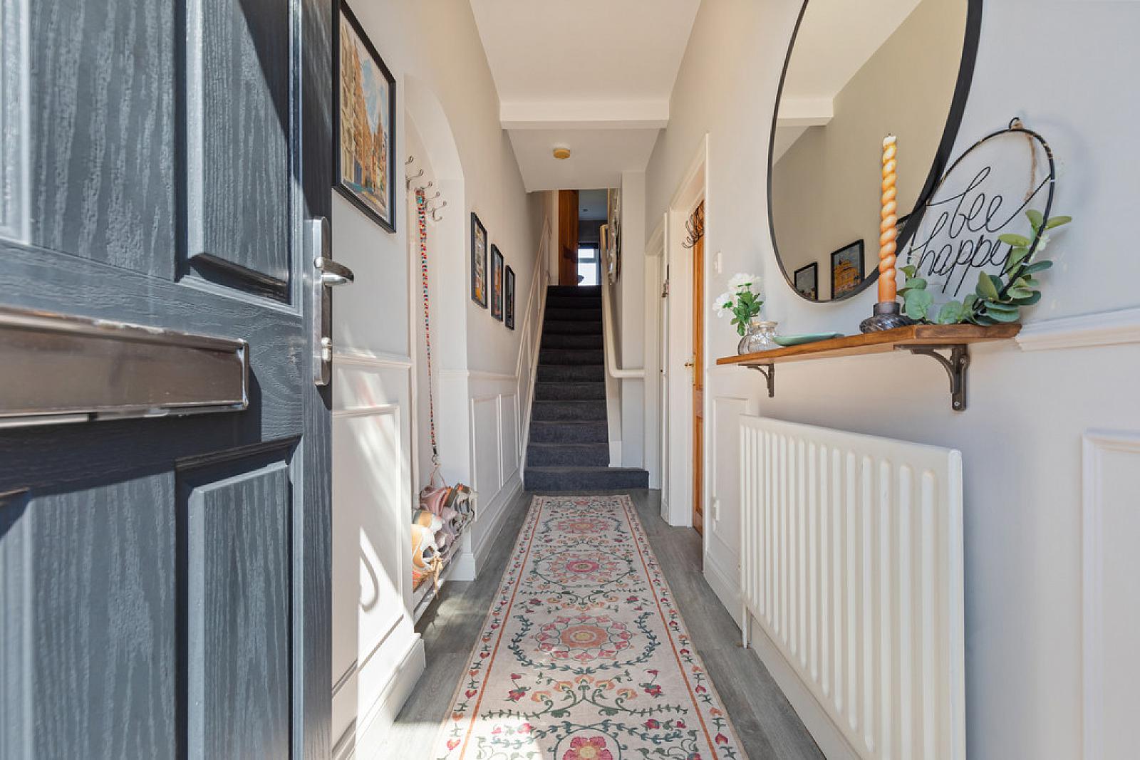 ENTRANCE HALL Composite front door with fan light, partially wood panelled walls.