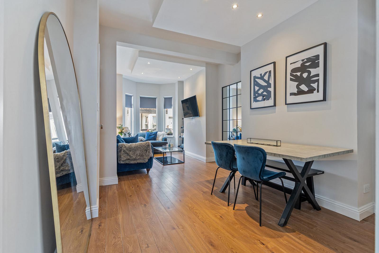 THROUGH LOUNGE 22' 10" x 10' 4" (6.98m x 3.17m) Bay fronted, wood strip flooring, spot lighting, under stair recess.