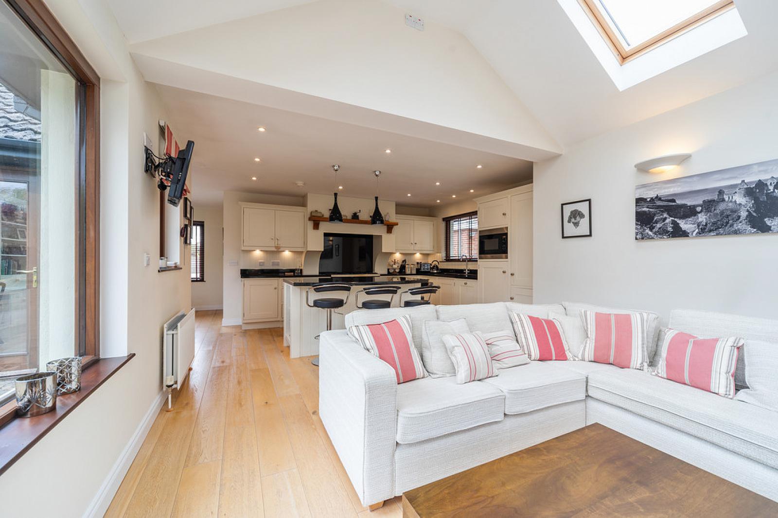 OPEN PLAN TO MAGNIFICENT LUXURY FITTED KITCHEN WITH BREAKFAST AREA AND OPEN ARCH TO LIVING ROOM 25' 8" x 15' 3" (7.82m x 4.65m) Extensive range of high and low level units, granite work surfaces with matching splashback, Franke 1.5 bowl stainless steel sink unit with granite drainer, Britannia cooker range with six ring gas hob and electric ovens with matching granite splashback, extractor fan over with wood mantle, integrated Neff dishwasher, bin drawer, eye level Miele microwave oven, integrated fridge and freezer, feature part wood panelled walls, island unit with matching granite work surfaces and breakfast bar, low voltage spotlights, solid wood flooring, vaulted ceiling to living area with Velux windows, feature corner windows overlooking the rear garden, glazed double doors to rear.