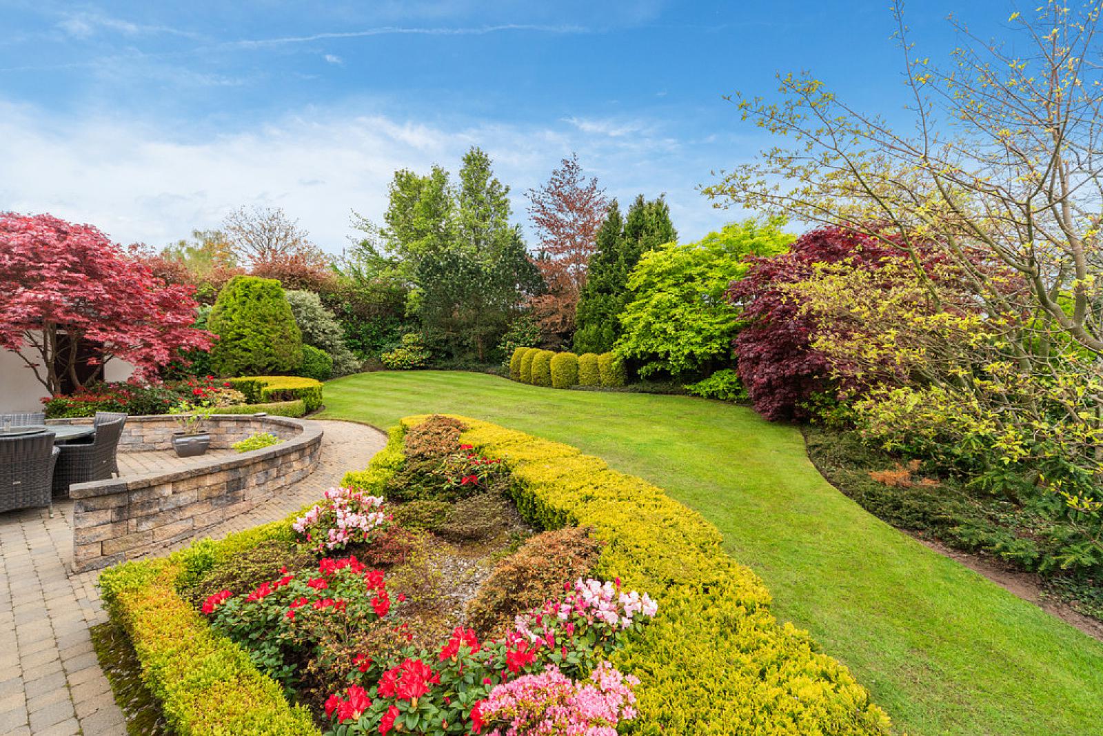 OUTSIDE Superb mature fully landscaped site with mature planting. Front garden in lawns with circular design and surround box hedging with flowerbeds, wide variety of plants and shrubs, paviour driveway with parking for several cars, leading to detached garage. Exceptional private enclosed south facing rear garden, with immaculate lawns with mature boundary planting, sheltered and private generous paviour sitting area.