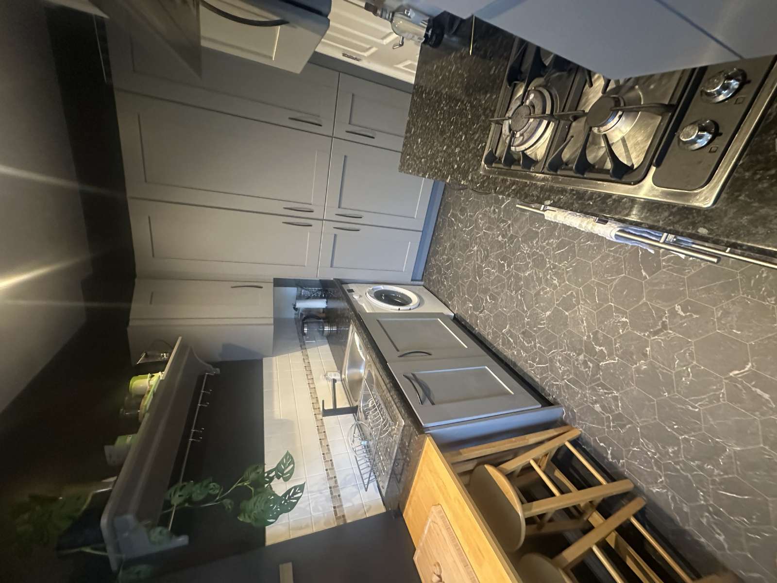 - Charming grey kitchen, with black granite work top, with a variety of high- and low-level units. Laid in vinyl flooring, and tiled splashback. The kitchen area comes equipped with integrated appliances, including, oven, gas hob, hood and fridge freezer.