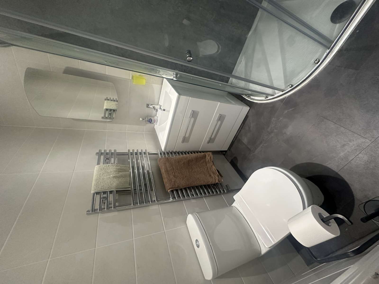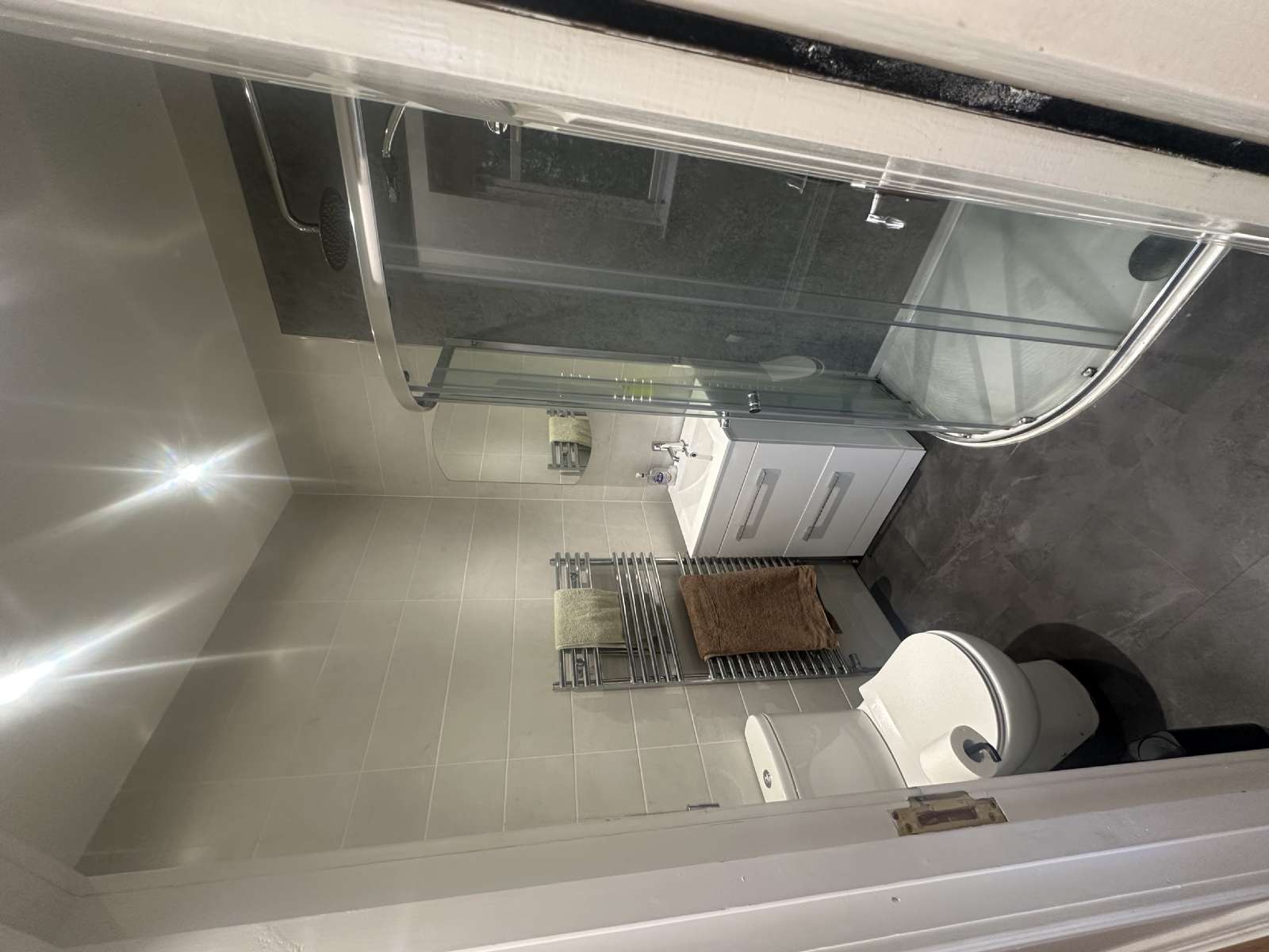 - Three piece white bathroom suite, consisting of rainfall shower, low flush WC, sink and vanity unit and heated chrome towel rail.