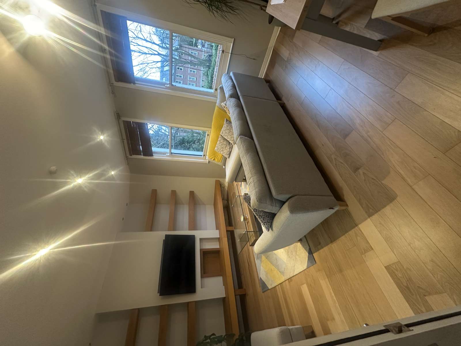 - Spacious living Area, laid in wooden flooring, with feature bay windows, allowing an abundance of natural light. Feature media wall, paired with a shelving area with spotlights.