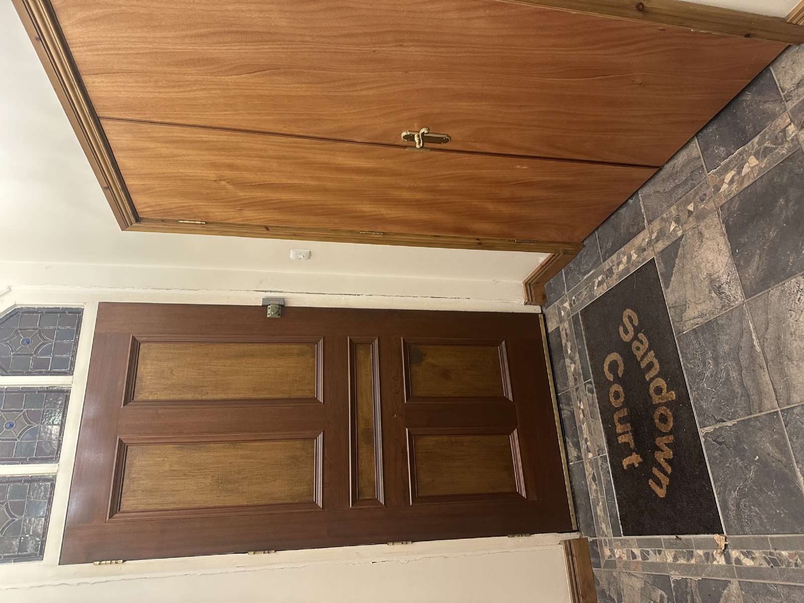 - Communal entrance doorway, with partially glazed stained glass door.