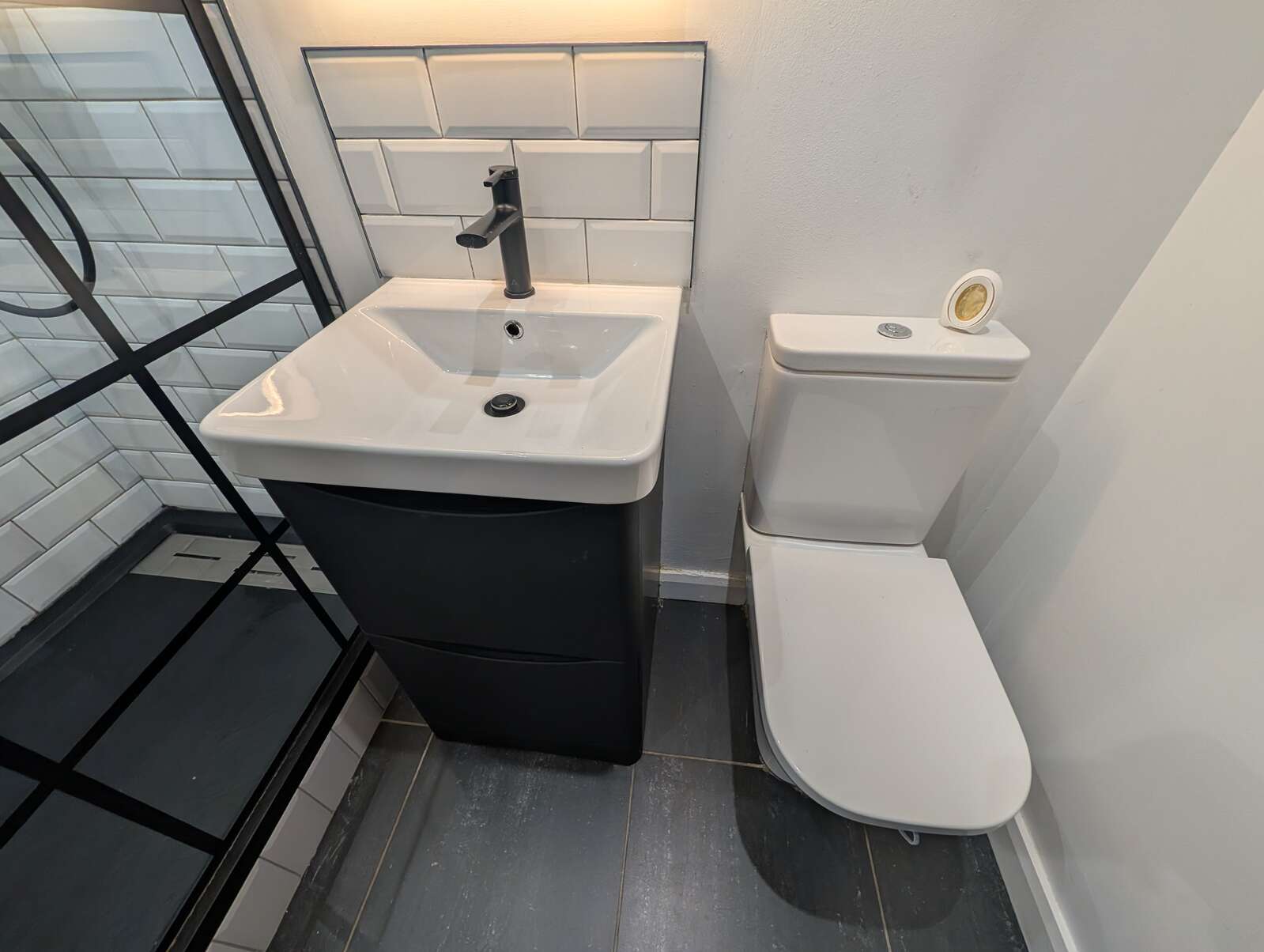 Contemporary modernised tiled shower room suite, comprising of walk in shower cubicle with monsoon shower-head, WC and wash hand basin.
