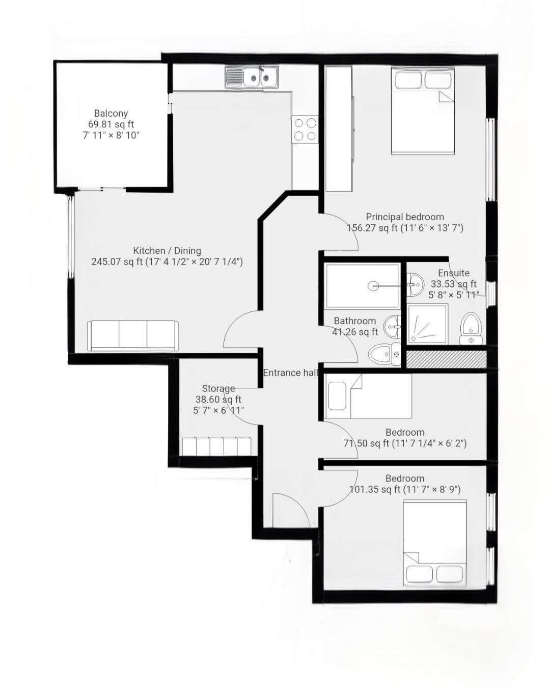 Stylish apartment comprising open plan lounge/ kitchen with dining area offering access to the balcony, modernised main bathroom with stylish walk in shower featuring monsoon shower head, 3 well-proportioned bedrooms, master with en-suite shower room, hallway with additional storage.