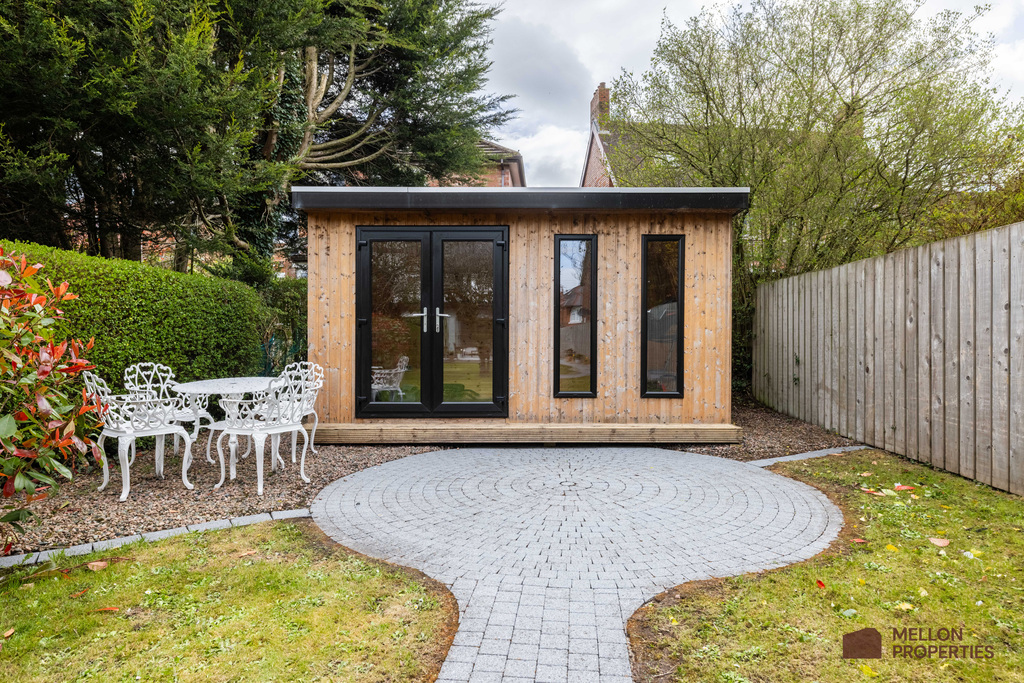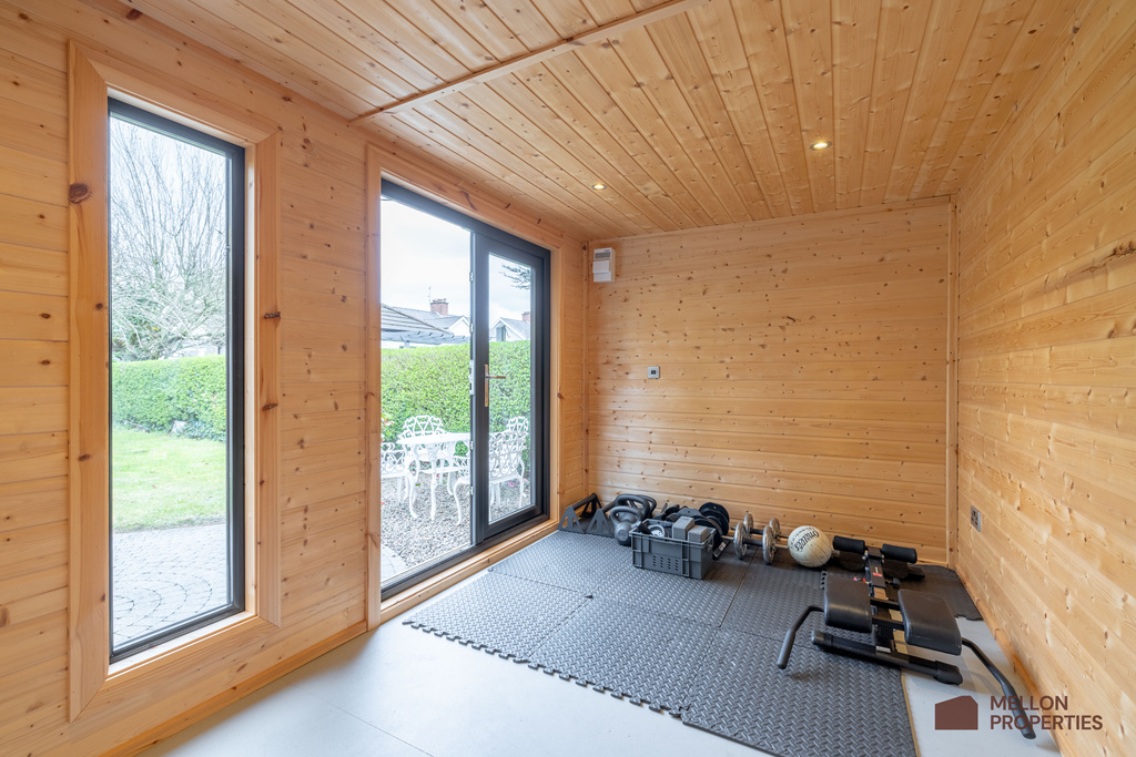 A paved path draws you down through the garden, wrapping around a beautiful apple tree at its centre, before reaching one of the home's most unique features, a fully insulated and wired garden room. Currently set up as a gym and home office, it's a flexible space that can grow with you, whether that's a creative studio, workspace, or even a small home business.