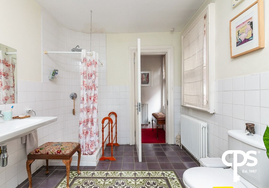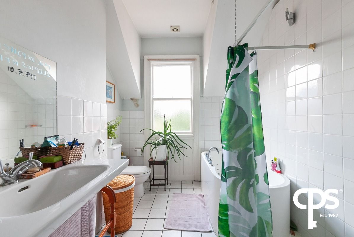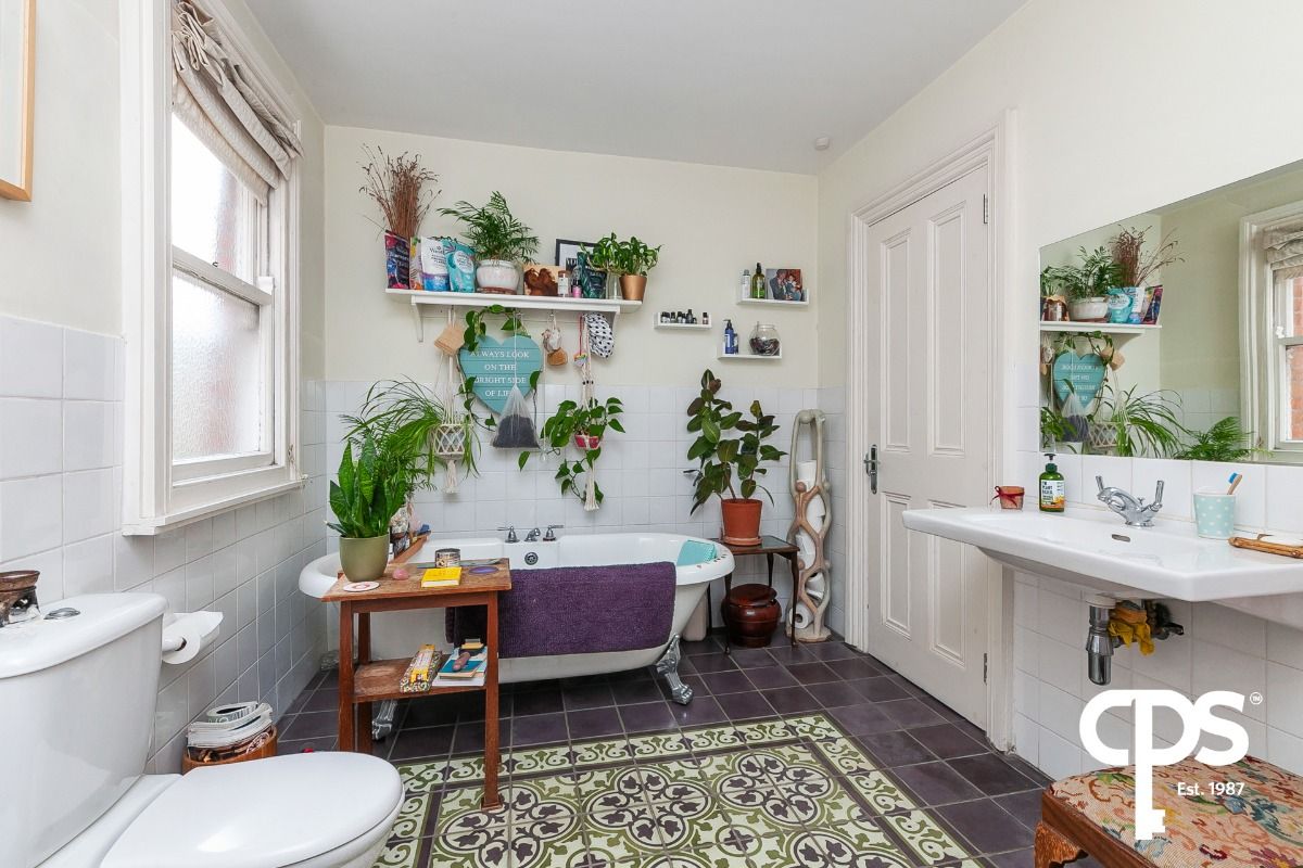 Fully tiled bathroom with a four-piece suite including; a free-standing bath, corner shower, WC and wash hand basin. The room uniquely has two separate access points from the hallway.