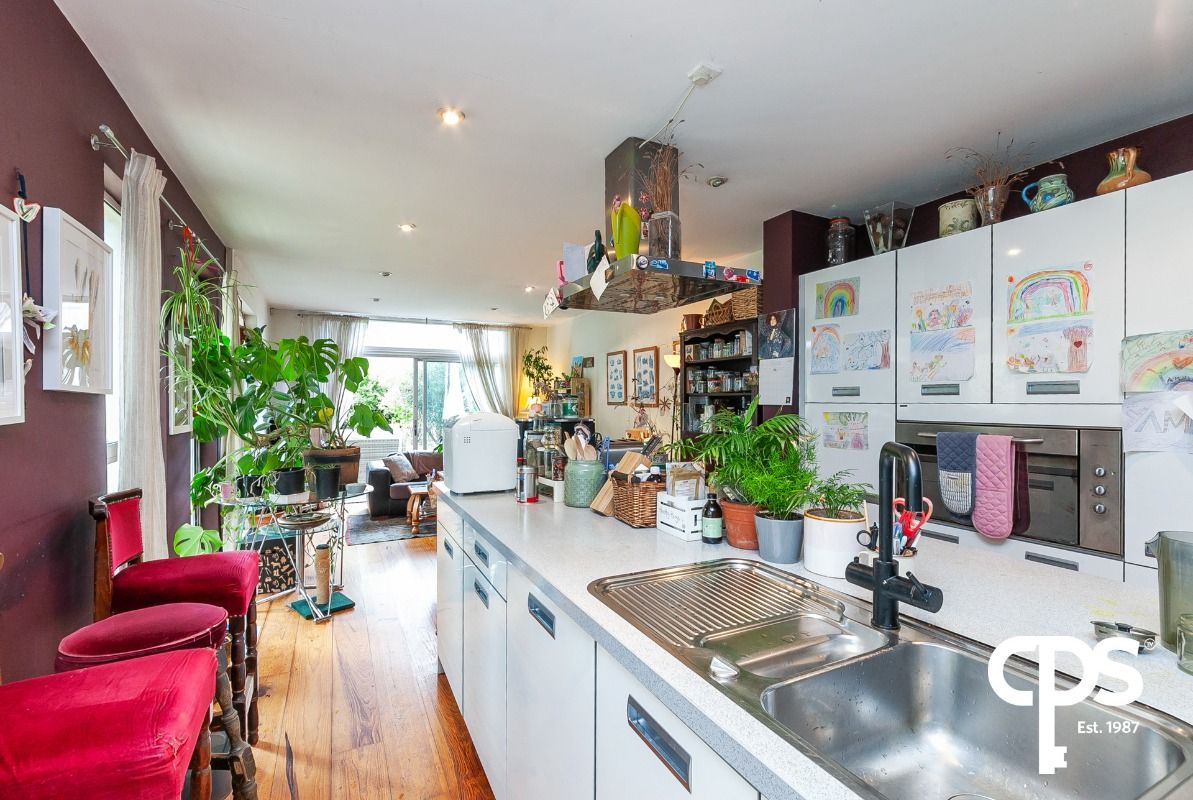 Spacious kitchen with wooden flooring and patio doors to the rear. Kitchen boasts eye level integrated oven, island with integrated hob. The kitchen opens up into a lounge area.