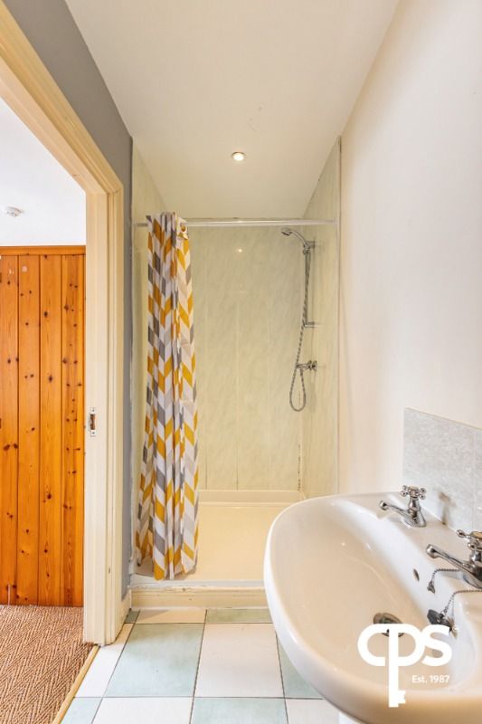 White suite comprising with W.C., wash hand basin, walk-in fully tiled shower cubicle, part-tiled walls and tiled floor.