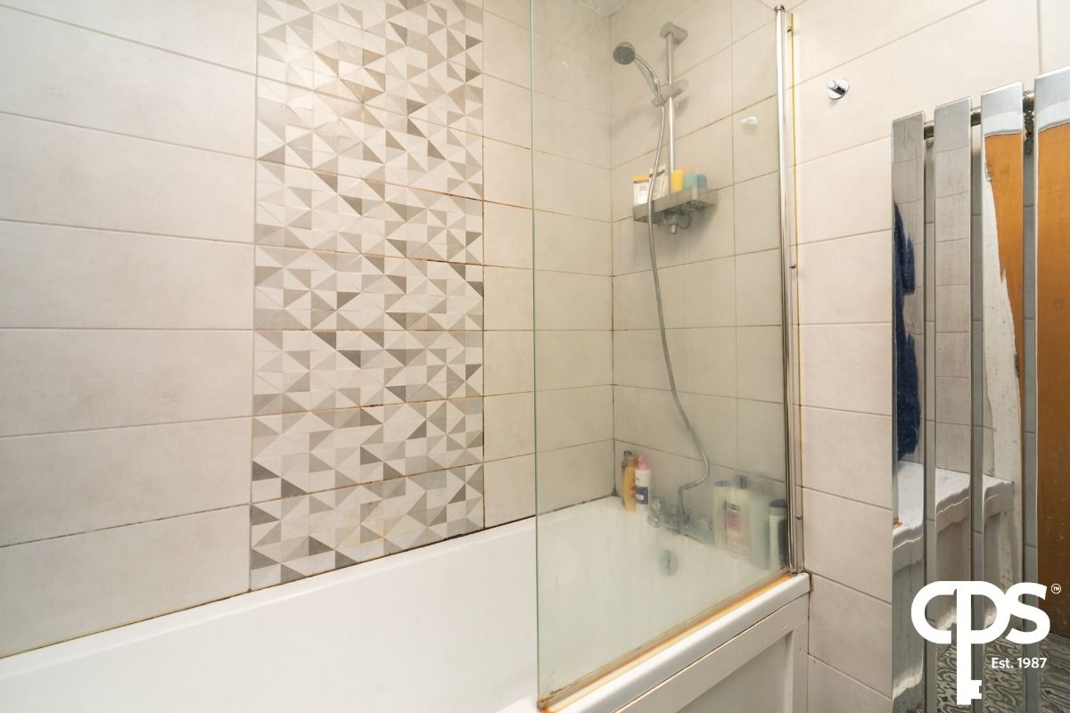 Contemporary bathroom, with tiled floors and tiled surround. Bathroom includes three-piece white suite with shower over bath.