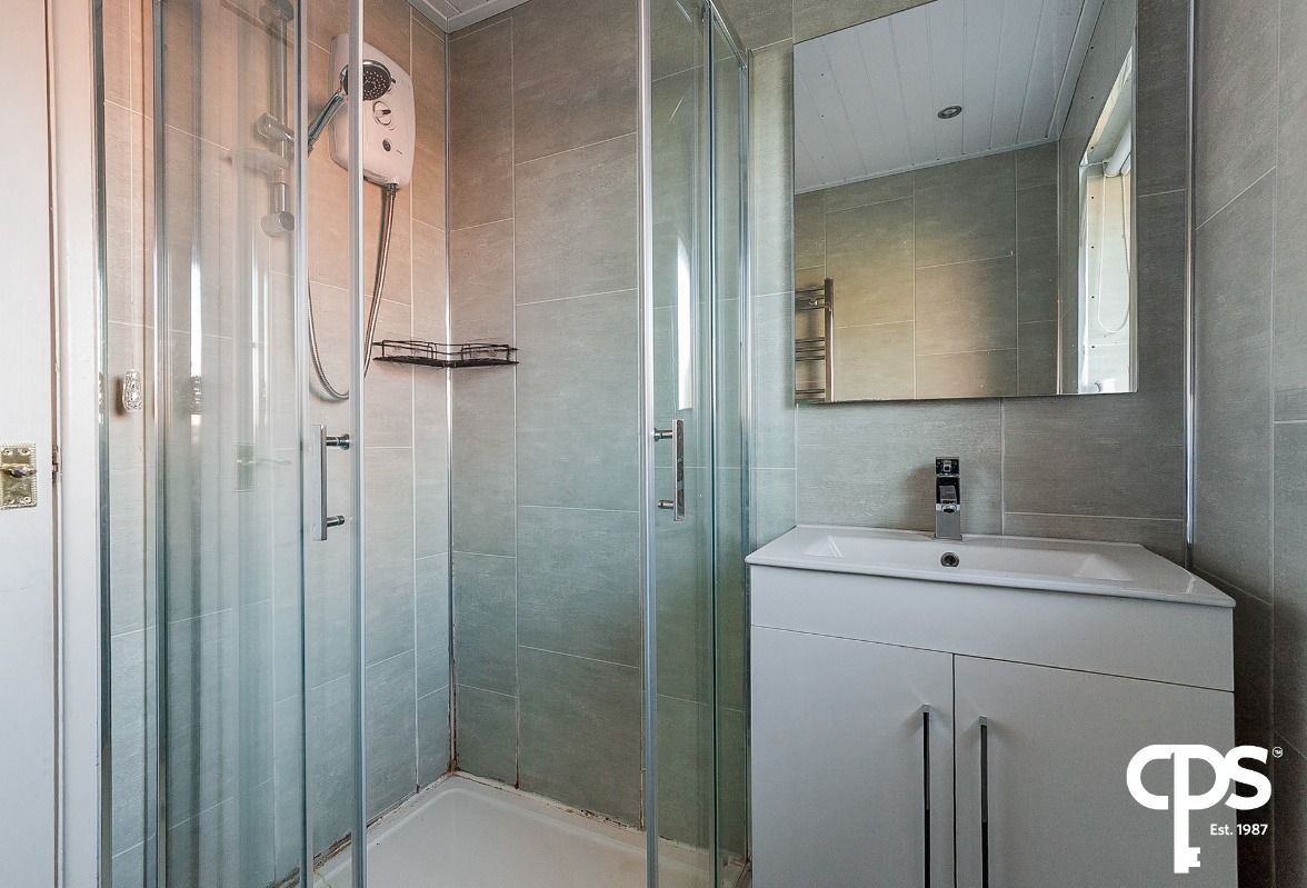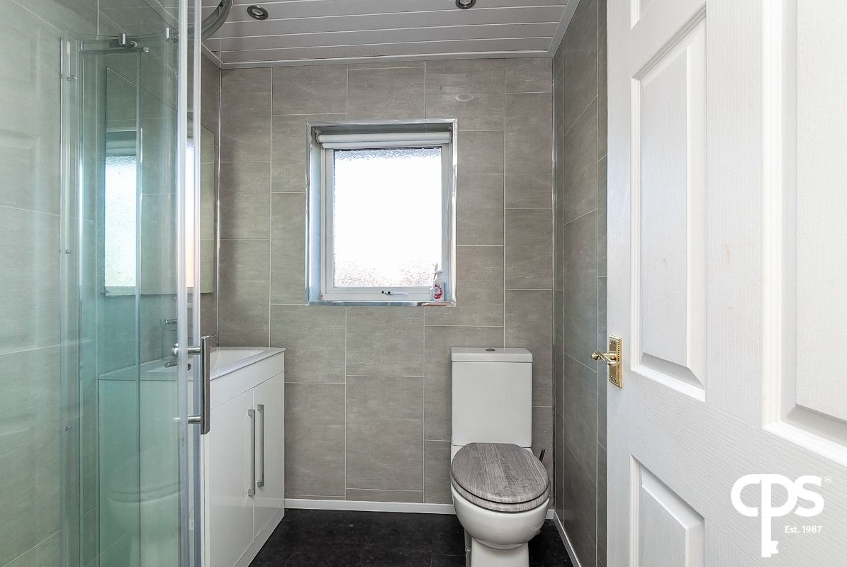 Modern family bathroom with three-piece white suite including corner shower, wc and vanity with chrome tap. Finished with tiled surround and pvc ceiling.