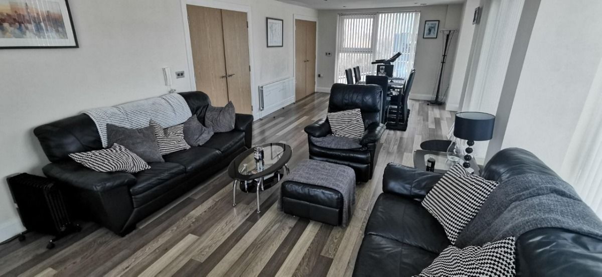 This apartment offers spacious living accommodation and comprises internally of entrance hall, three generously proportioned bedrooms, (one with en-suite shower room), family bathroom, spacious living area with a seperate fully fitted kitchen.