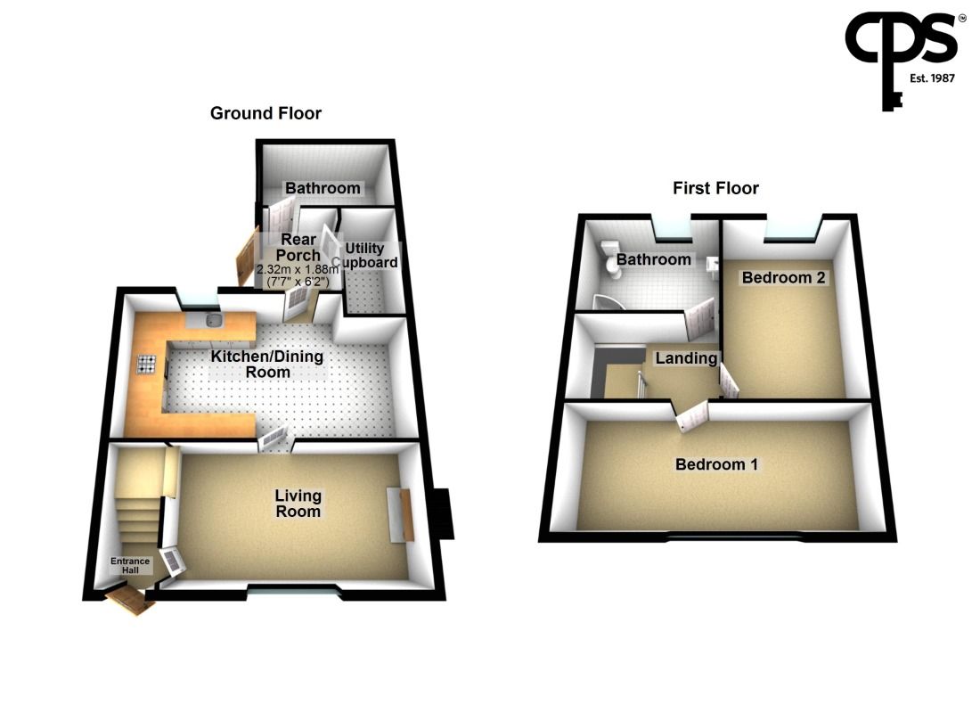 Internally, this substantial home has been well-maintained and thoughtfully laid out to maximise space and natural light. The ground floor offers a bright and welcoming living area leading through to a spacious kitchen/ dining space along with added convenience of a downstairs bathroom. The first floor holds two well-proportioned bedrooms and a second bathroom, providing excellent flexibility for modern living. Externally the property boasts a private partially decked, partially astro turfed rear garden and front yard.