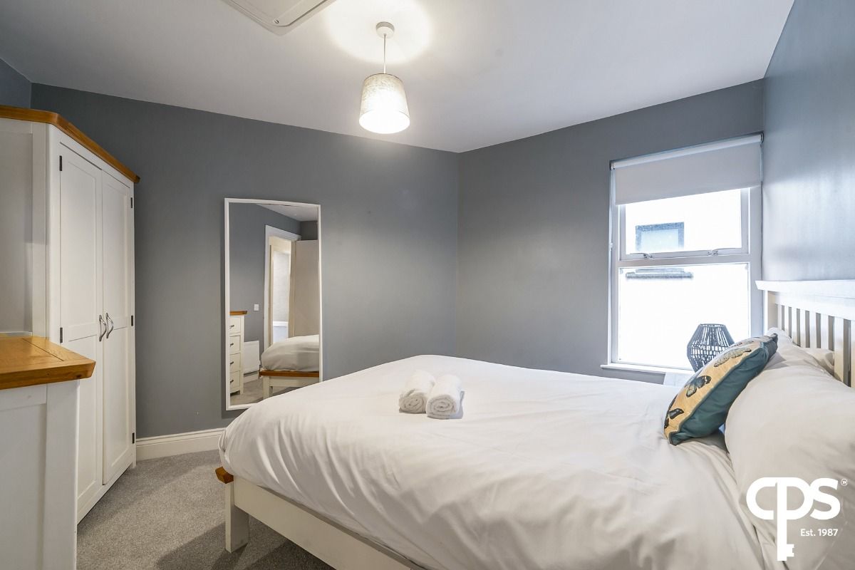 Spacious double bedroom with carpet flooring and neutral décor.