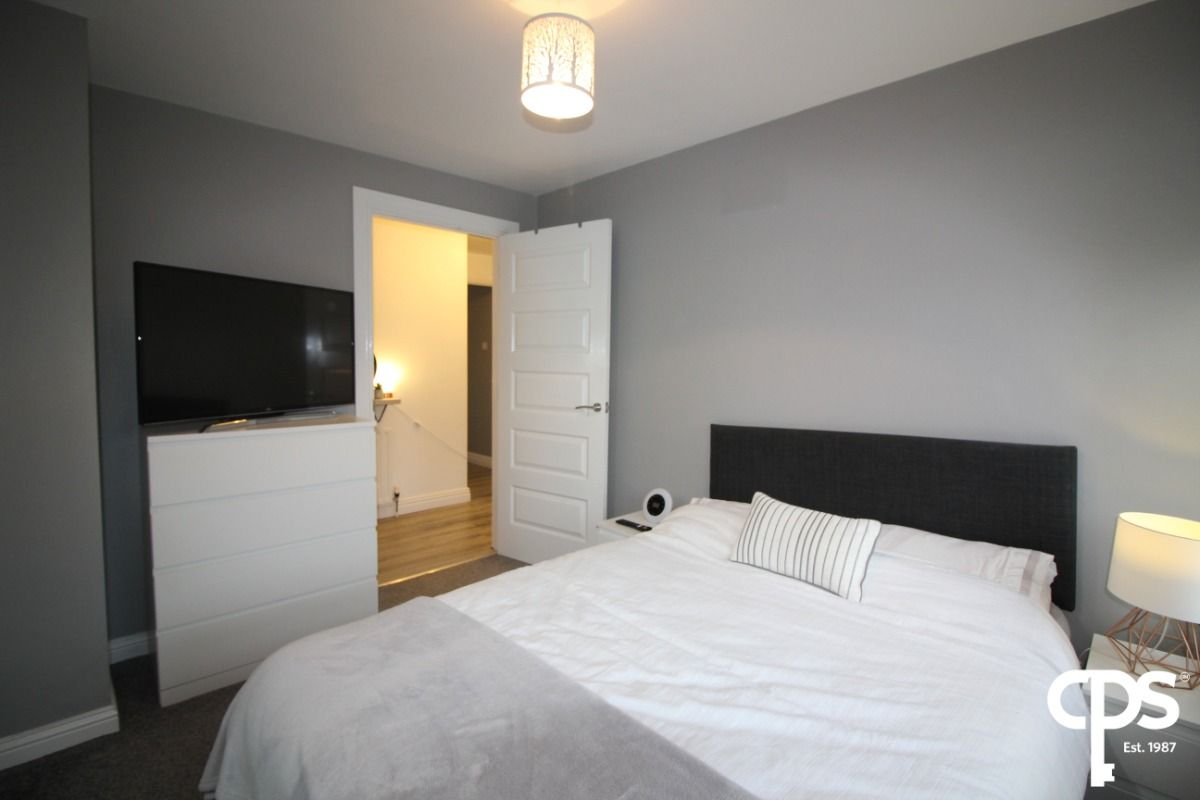 Spacious and bright principal bedroom finished to a high standard with neutral décor and carpet flooring.