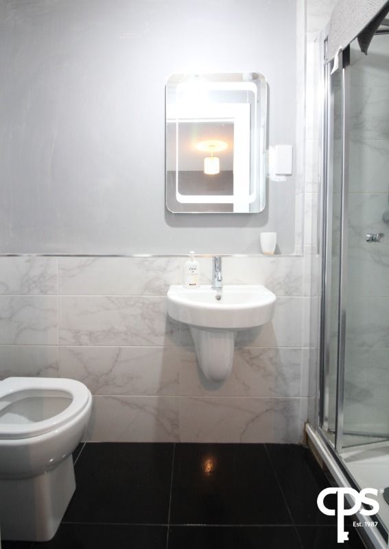 Modern ensuite comprising a three-piece white suite including low flush WC, wash hand basin, and shower, finished with tiled flooring and marble-effect tiled surround.
