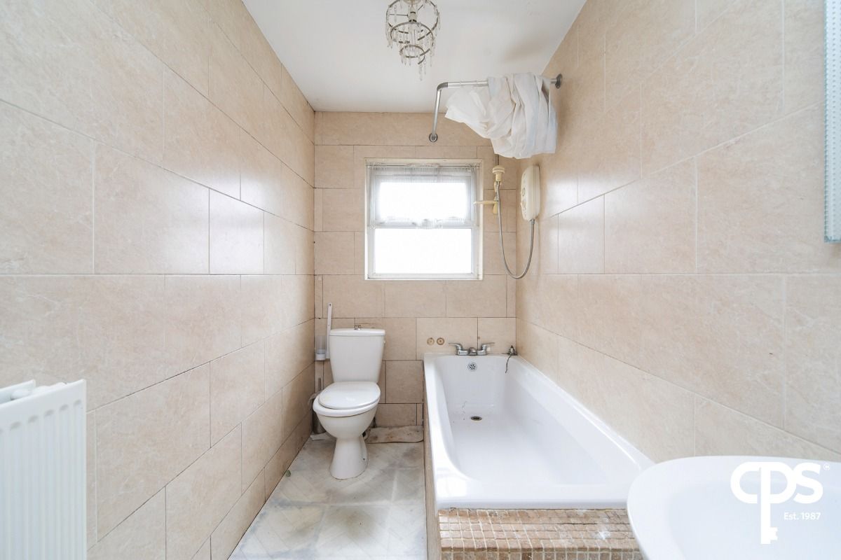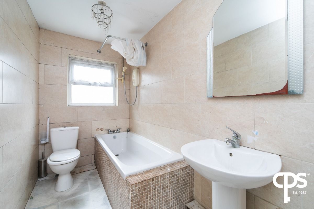 Family bathroom finished with neutral tiled walls and a white three-piece suite.