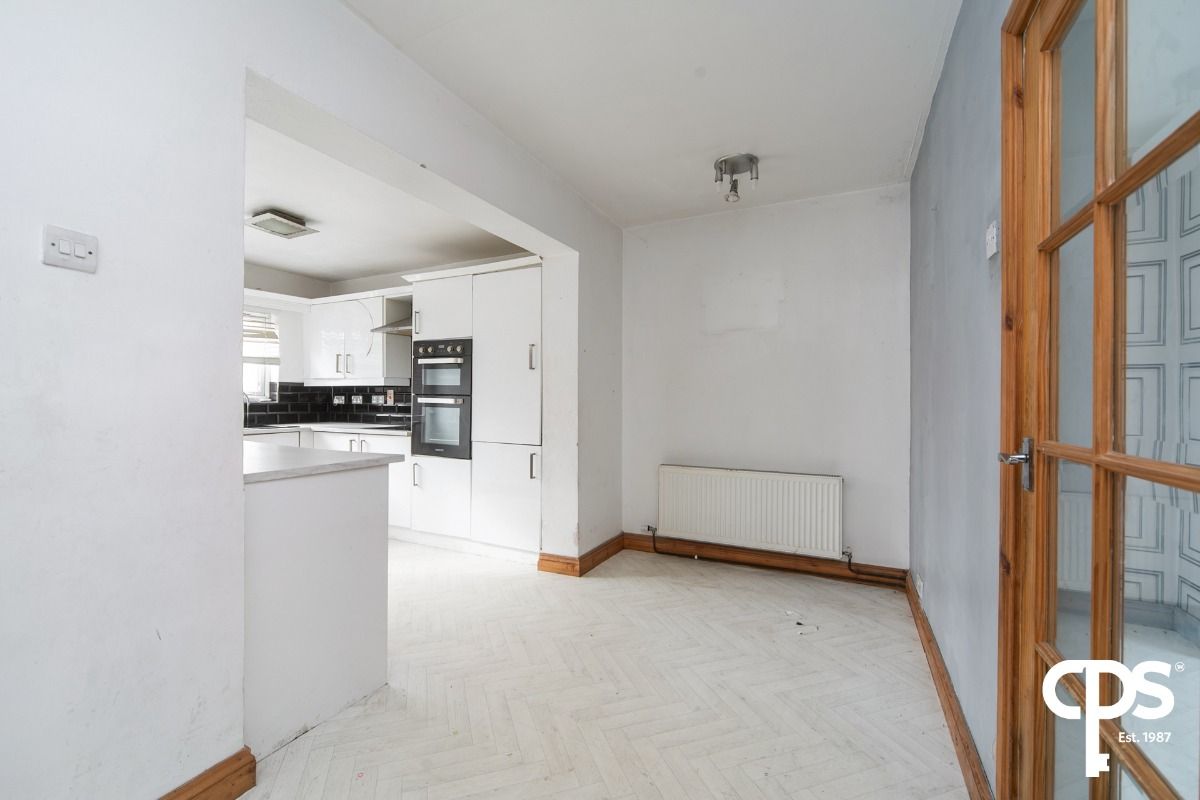 A spacious open-plan kitchen and dining area offering an ideal setting for family meals and entertaining. The kitchen benefits from contemporary fitted units high and low, integrated appliances and a tiled splashback, with ample space for dining.