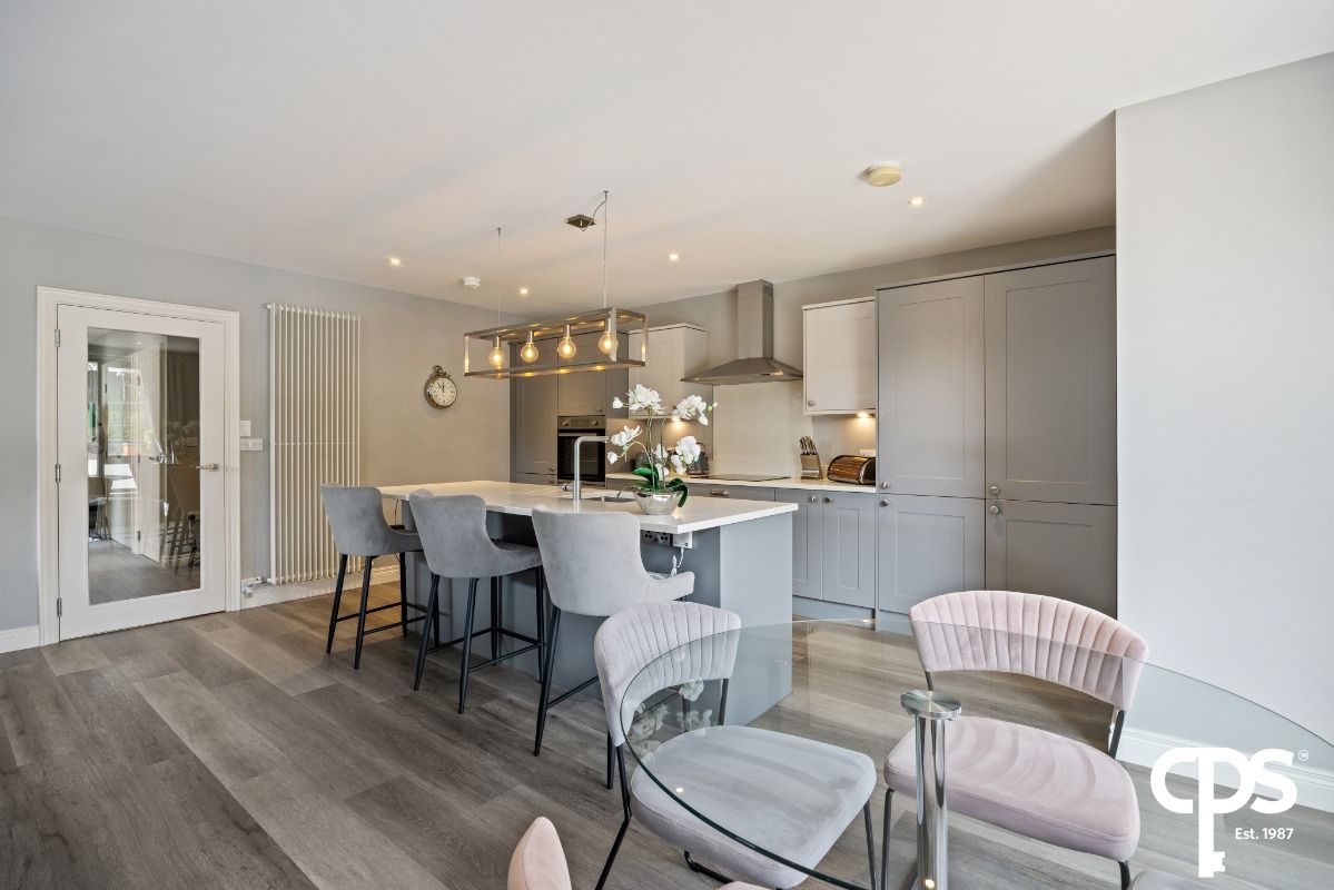 The modern fitted kitchen is beautifully appointed with a range of high and low units, generous worktop space and a breakfast bar island, ideal for casual dining. Integrated appliances include fridge freezer, dishwasher, four ring hob and extractor fan, ensuring functionality and a clean, stylish finish.
