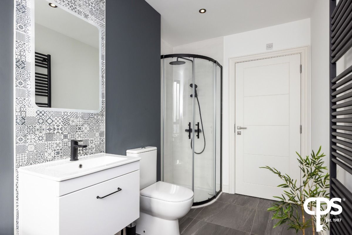 A contemporary ensuite shower room comprising walk-in shower, floating wash hand basin set within vanity unit and low flush WC. Finished with a tiled flooring and feature tiled surround, the space is further complemented by a stylish matte-finish heated towel rail and waterfall shower adding a modern touch.